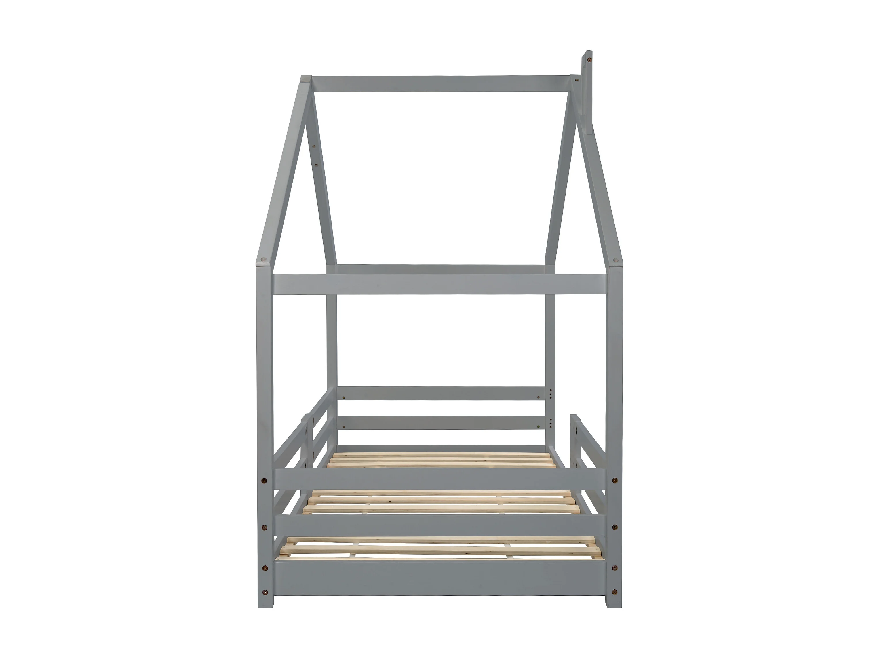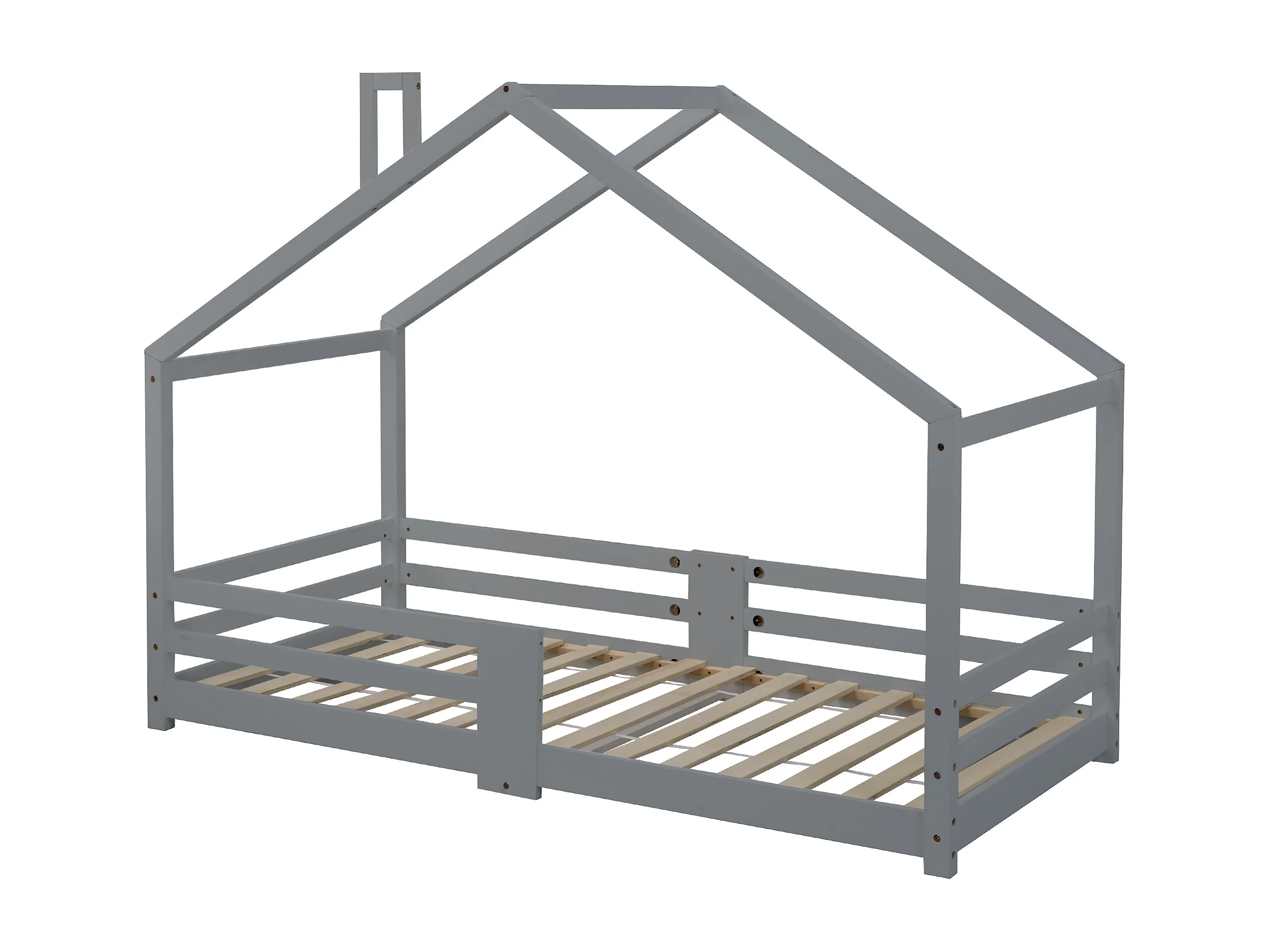 Lit cabane 90x200 cm avec protection anti-chute - sommier à lattes en bois - gris (sans matelas)