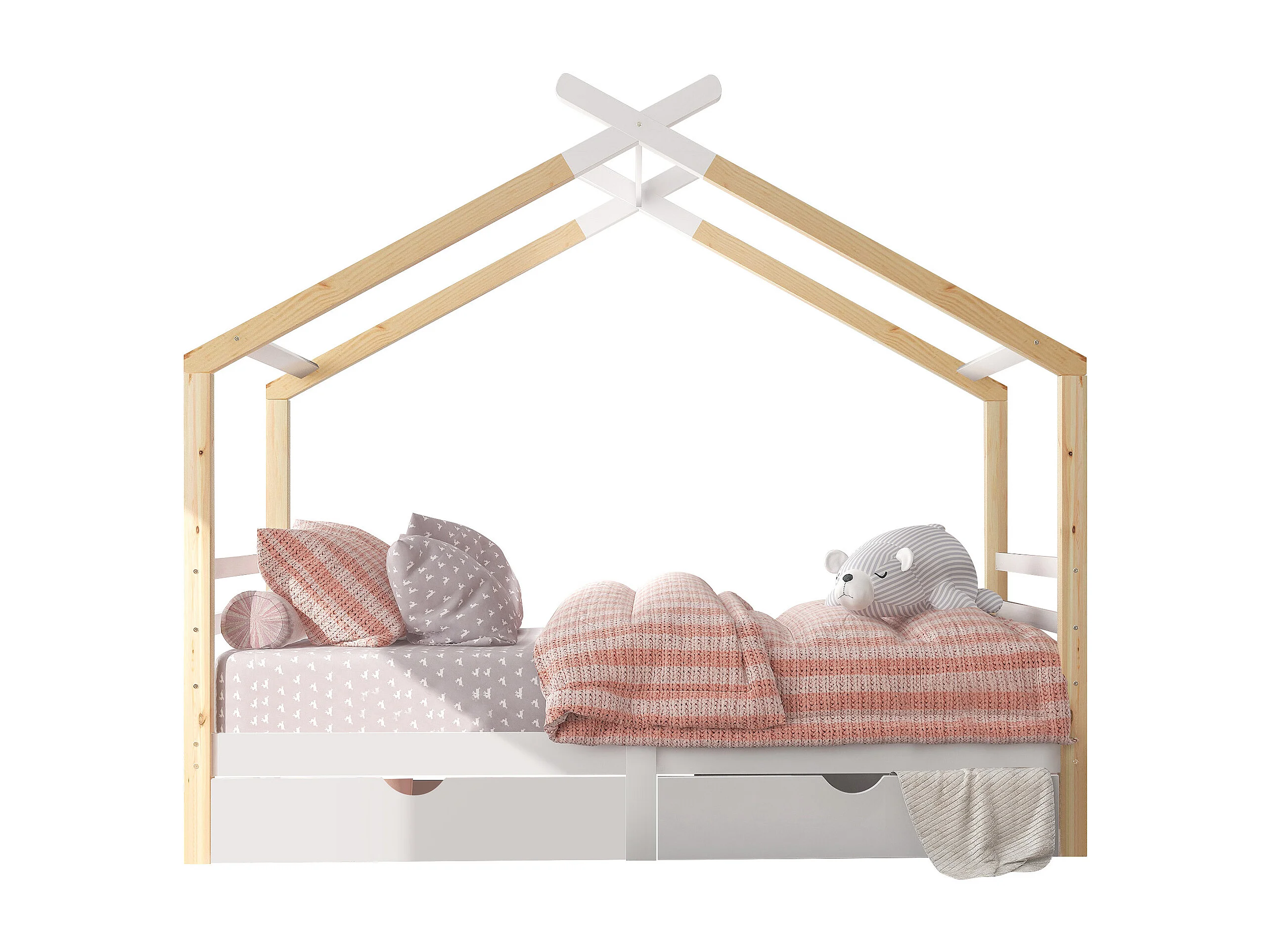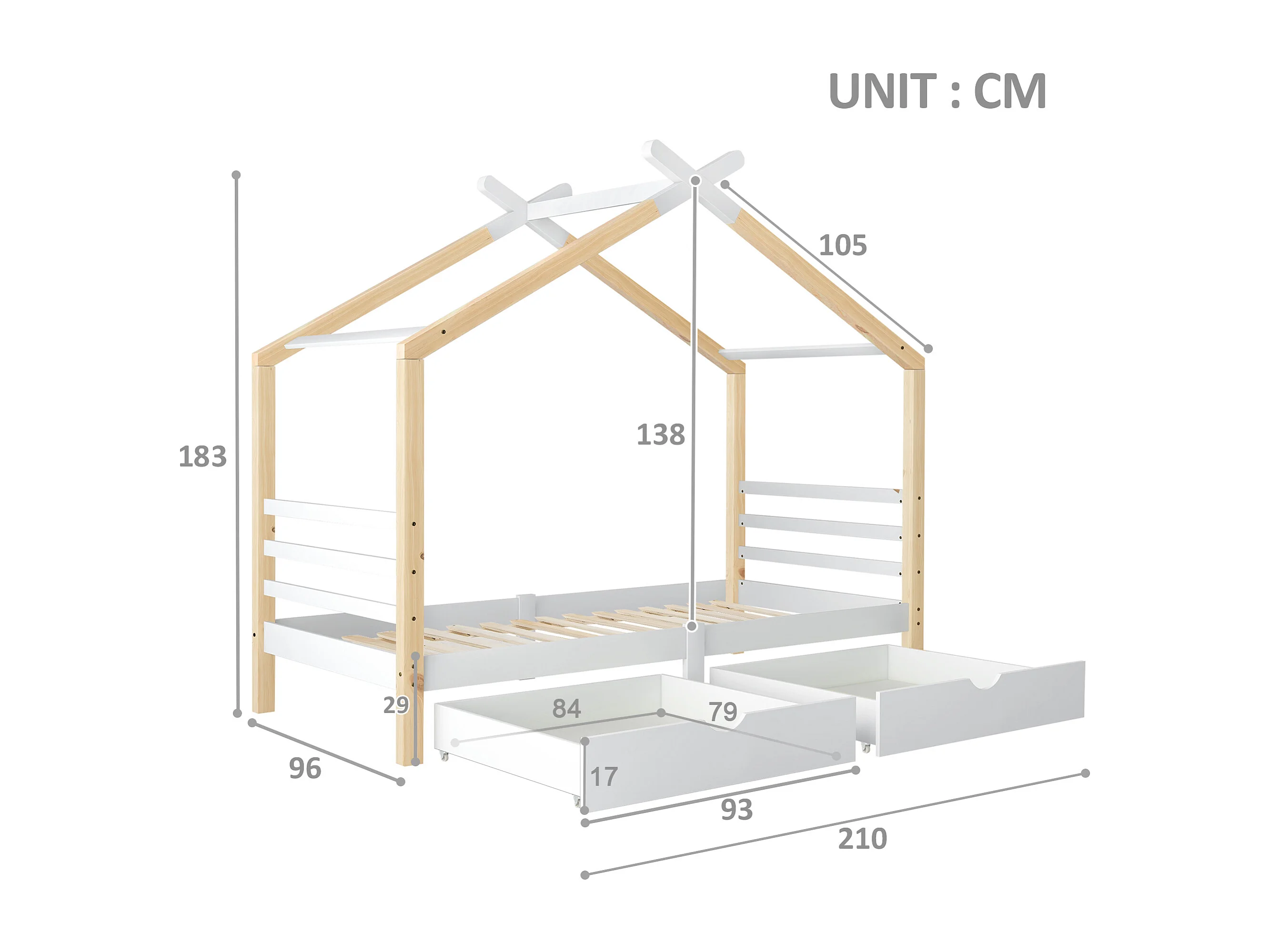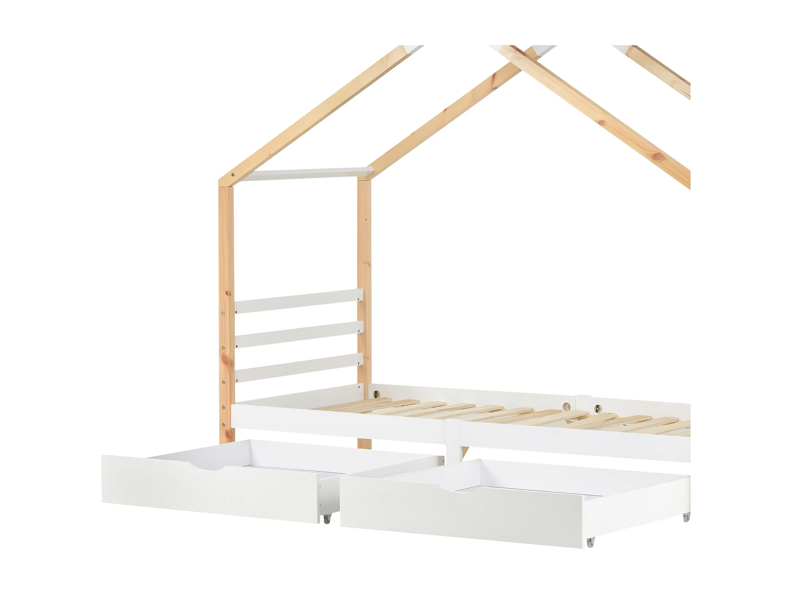 Lit cabane 90x200cm avec cadre sommier à lattes protection anti-chute tiroir - Bois - Blanc - (sans matelas)