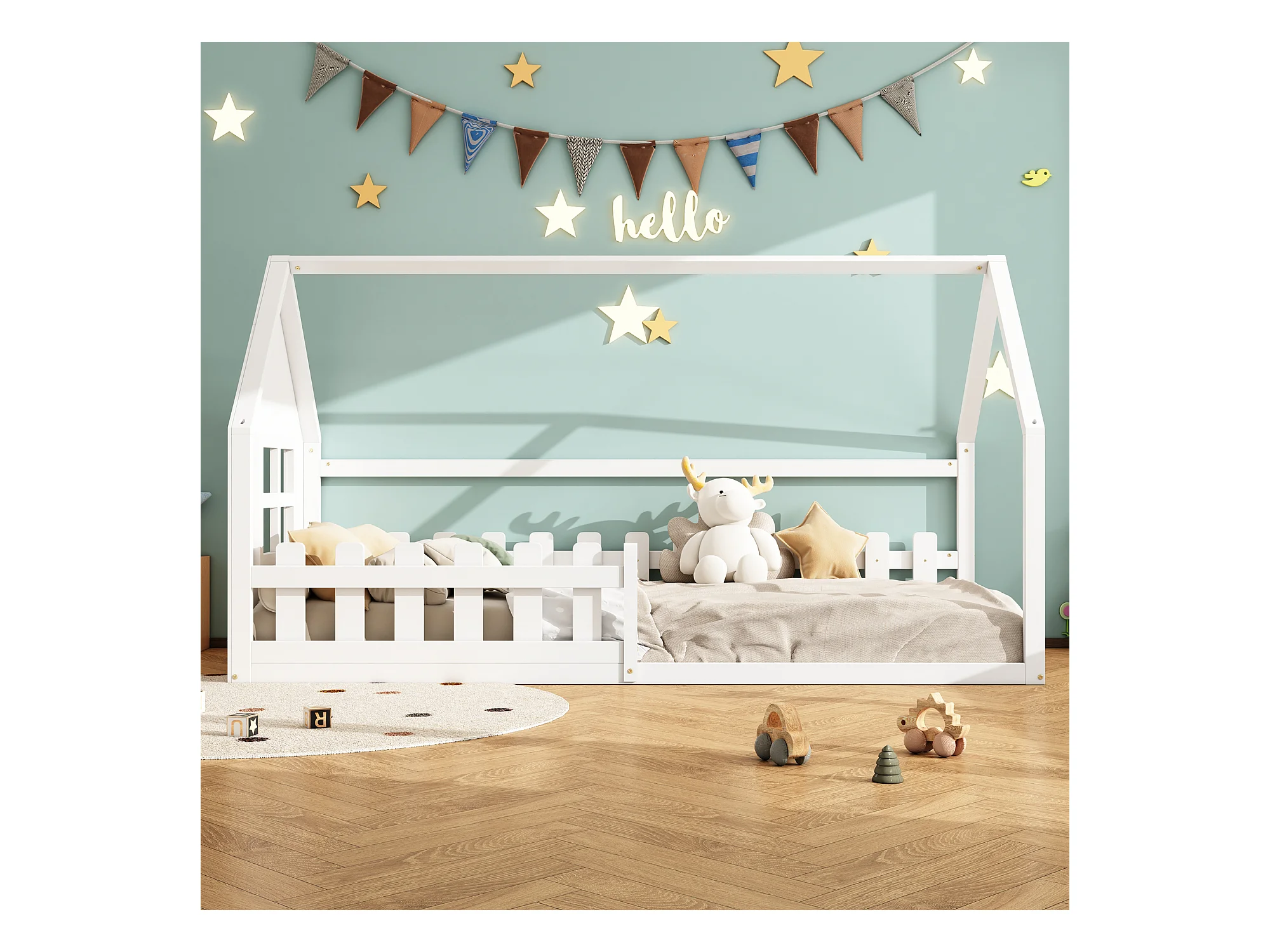 Lit cabane enfant 90x200cm, avec sommier à lattes, lit plat, lit enfant, barrière antichute, pin massif, Blanc