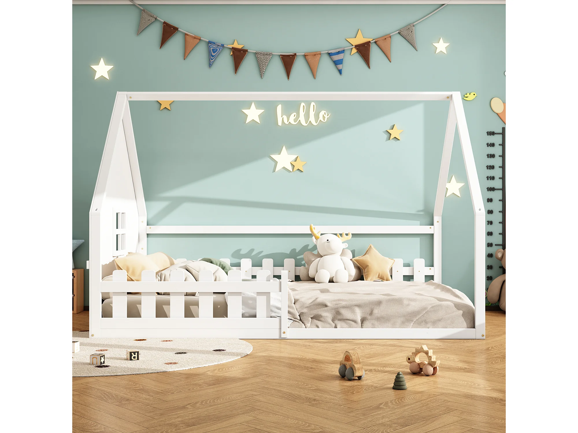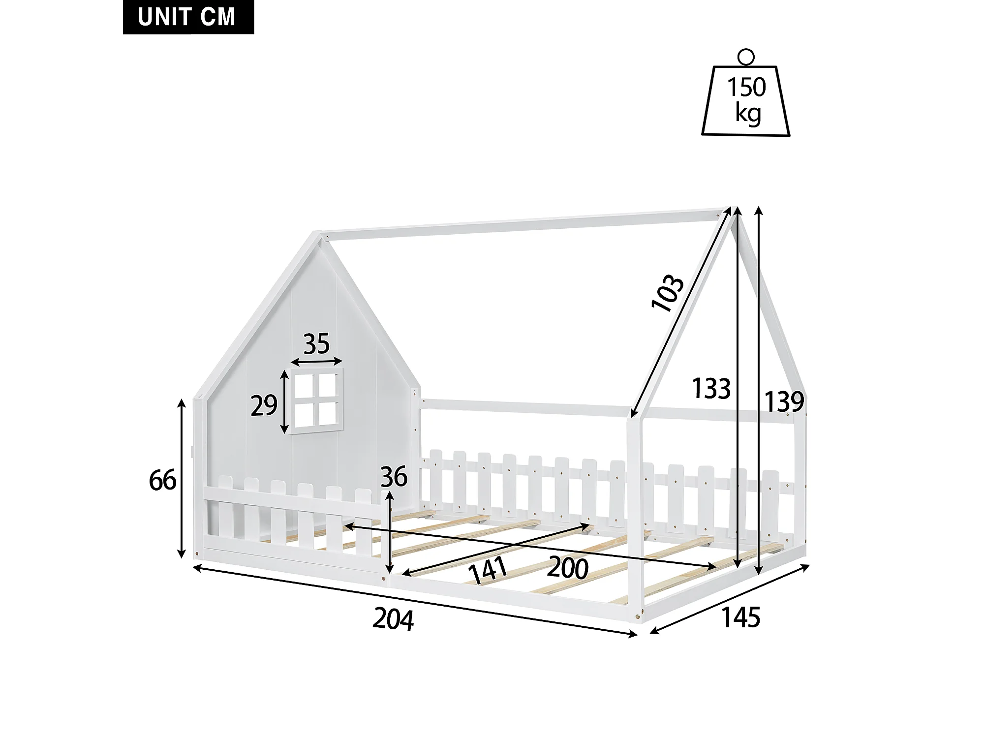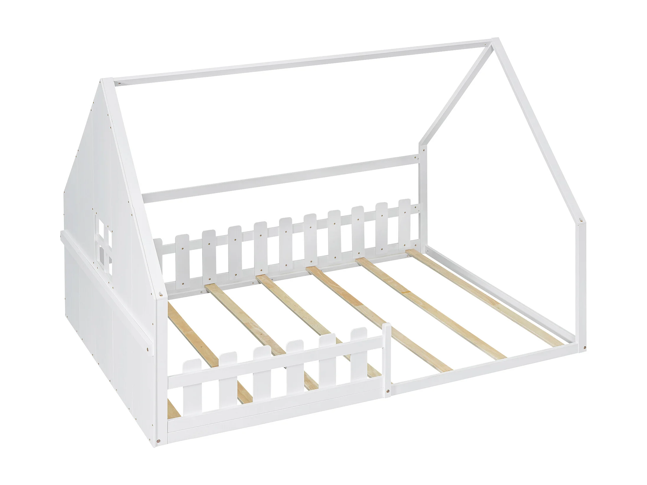 Lit cabane 140x200 cm avec sommier à lattes - avec barrière de protection - Pin - blanc (sans matelas)