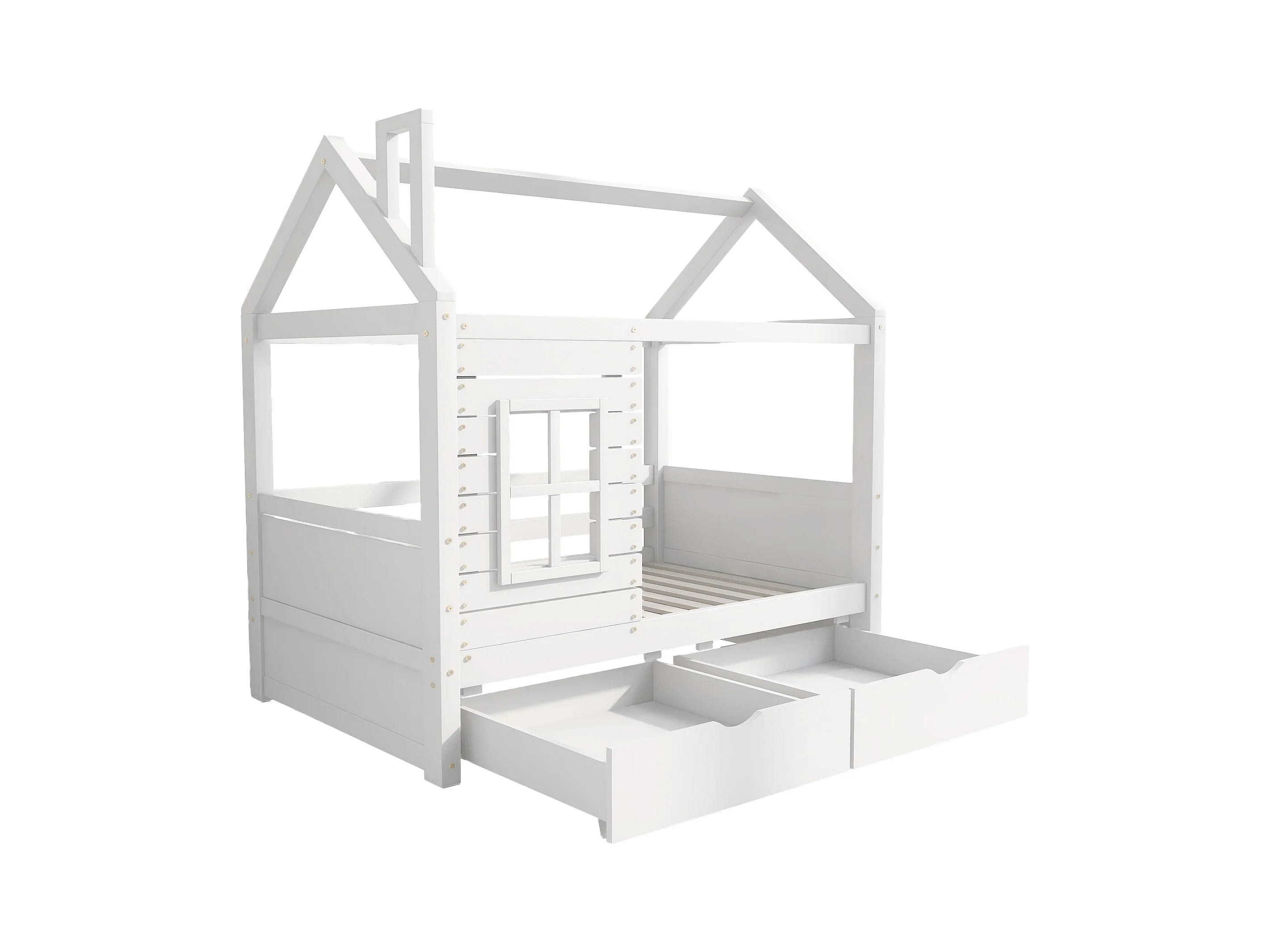 Lit cabane enfant 80x160cm avec 2 tiroirs blanc, dispositif antichute, forme maison, pin, sans matelas