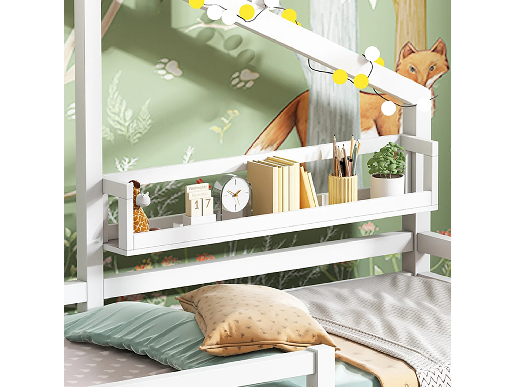 Lit cabane enfant 90×200 cm avec étagère intégrée, forme cheminée, structure en bois massif blanc