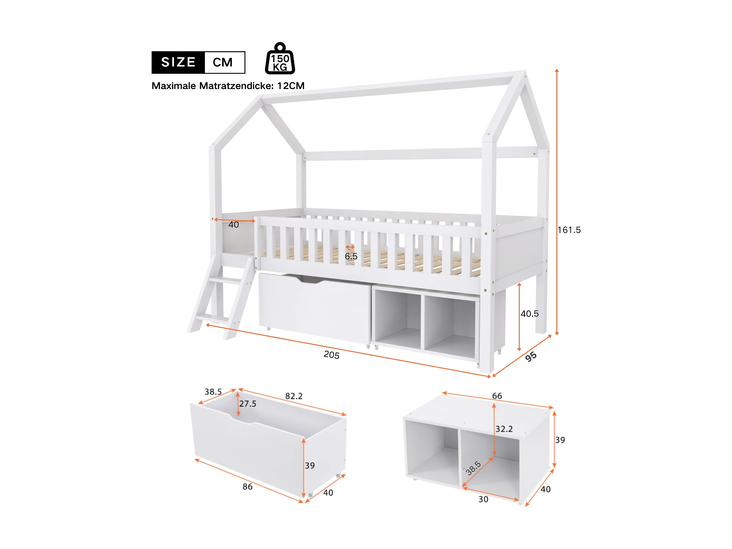 Lit cabane enfant 90×200 cm avec tiroirs et étagères, barrière de sécurité, bois massif blanc