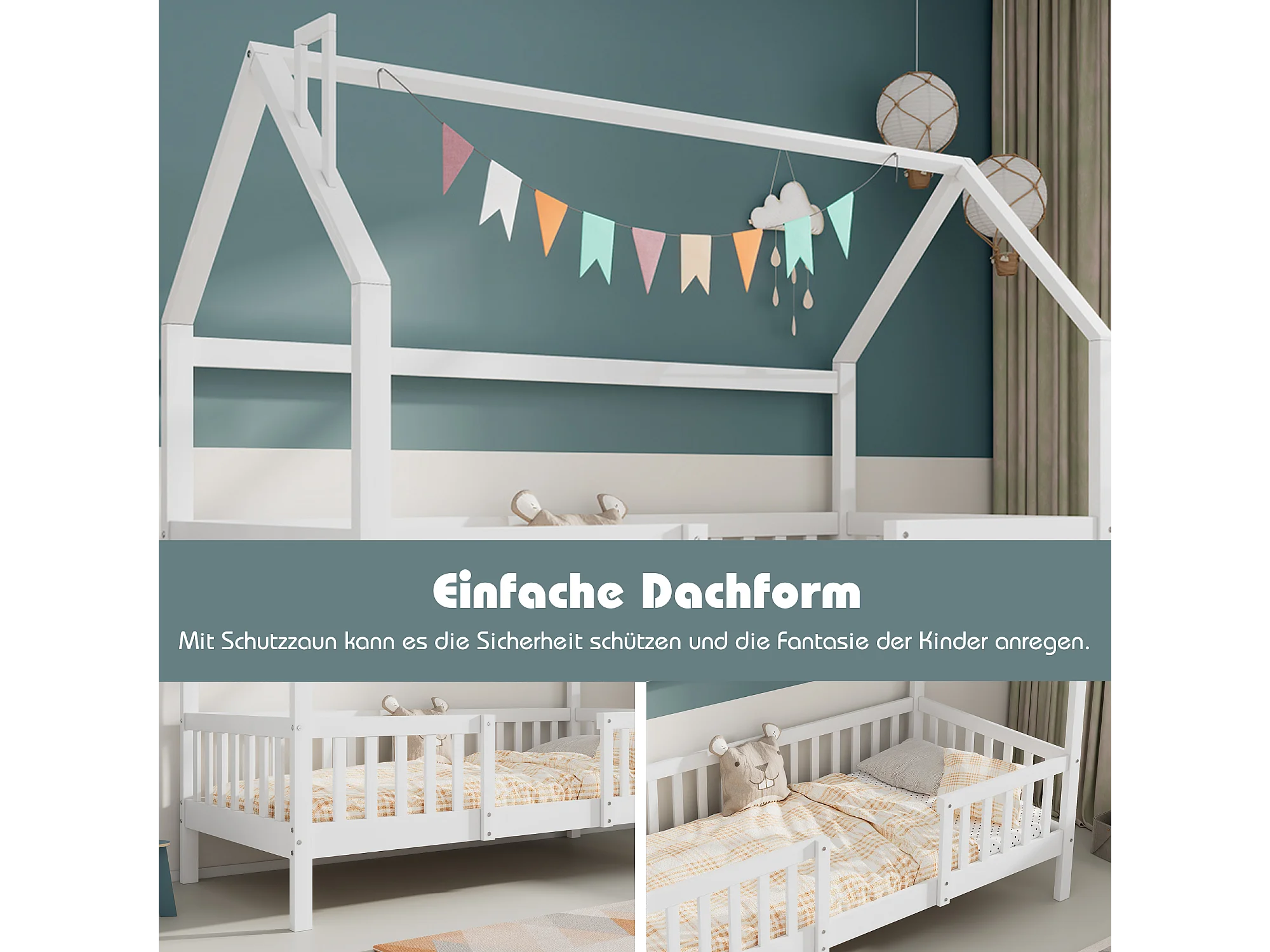 Lit cabane enfant 90×200 cm avec toit cheminée, sommier robuste en pin massif, couleur blanche élégante