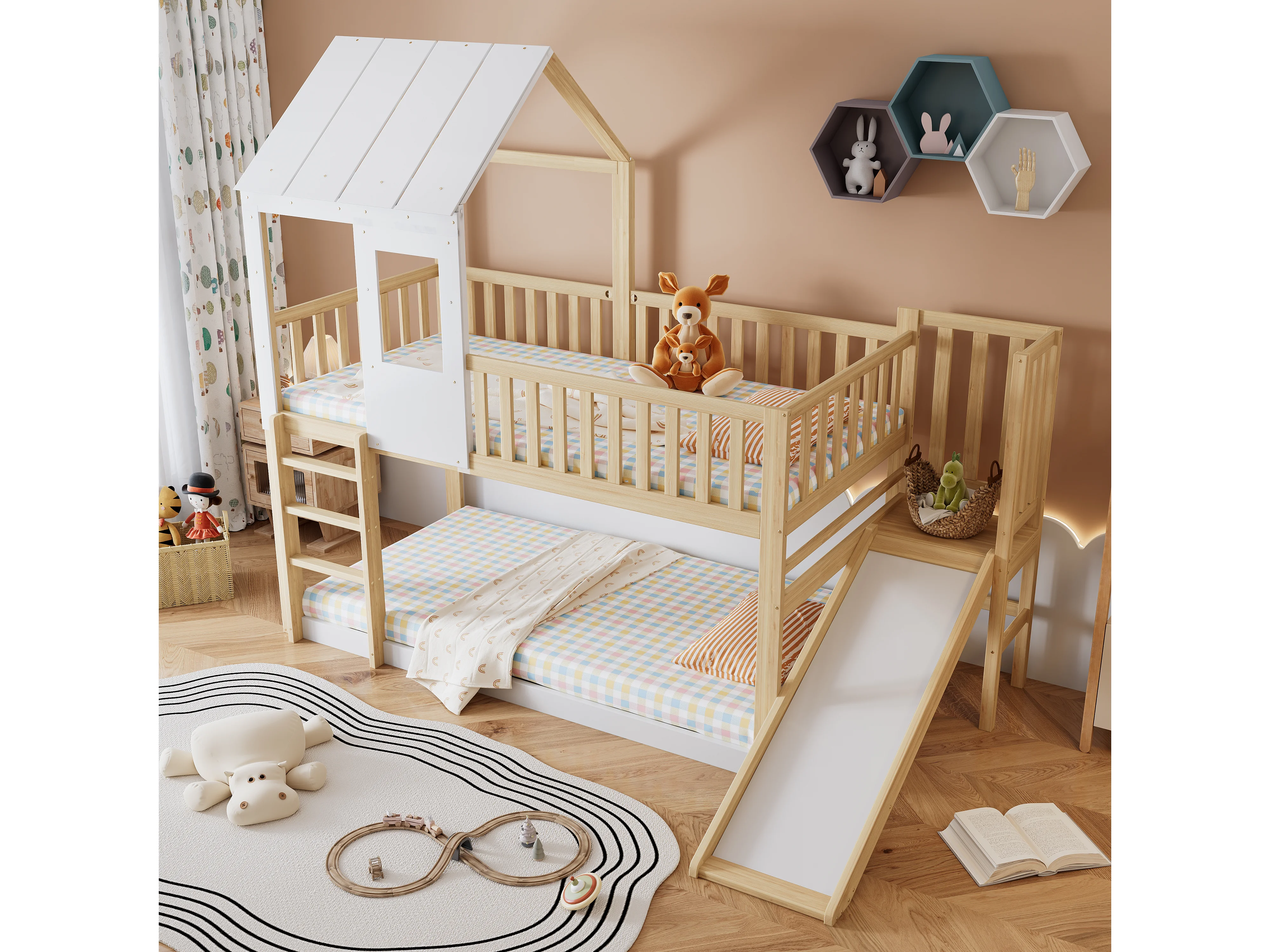 Lit cabane enfant 90x200cm, lit superposé avec tobaggan,escalier, cadre en pin+MDF, 1 sommier inclus, blanc, sans matelas