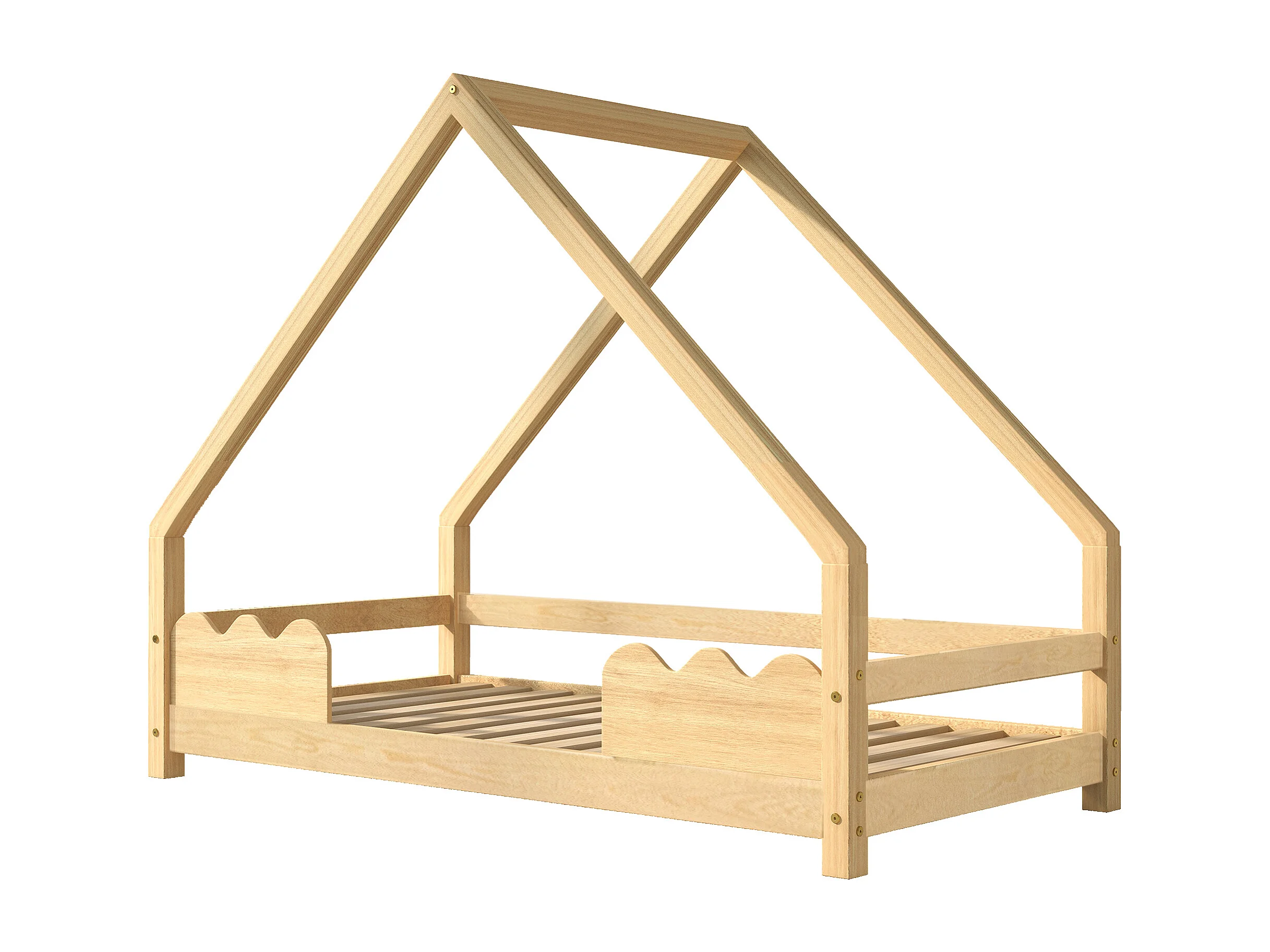 Lit enfant Maison 90 x 200 cm - Structure Maison en Bois Massif de Pin - Avec Barrières Ondulées, Sommier Inclus, Sans Matelas - Couleur Naturel