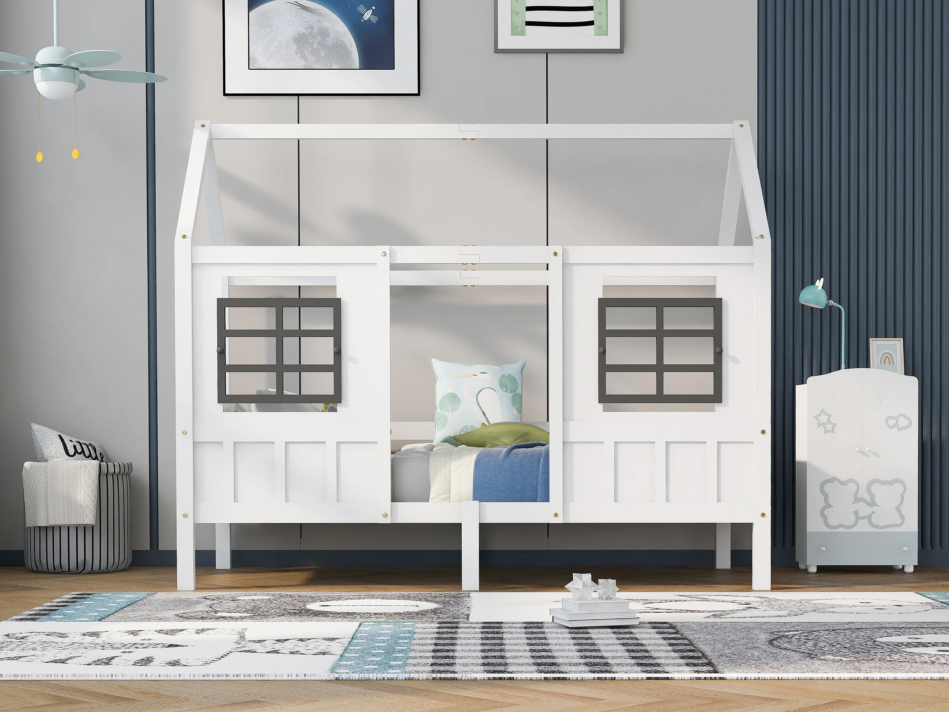 Lit cabane 90x200cm, lit enfant plat en forme maison avec sommier à lattes, en pin massif, blanc