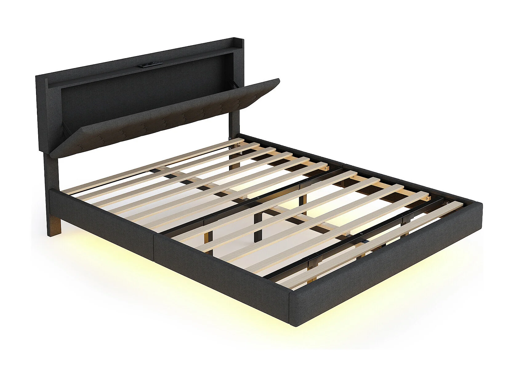 Lit double avec LED RGB, tête de lit avec rangements et ports USB/Type-C, 4 tiroirs de rangement, tissu en lin Gris – 160x200 cm