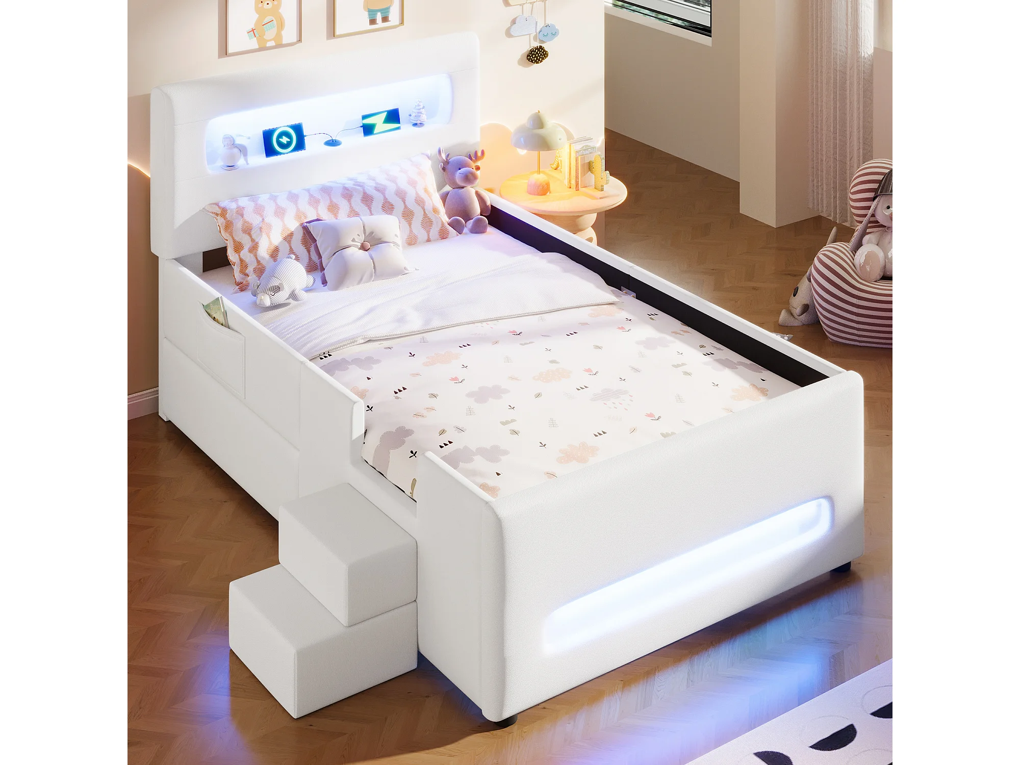 Lit capitonné pour enfant - 90 x 200 cm - avec escalier + tiroirs + tête de lit avec Leds et rangement -MDF - blanc