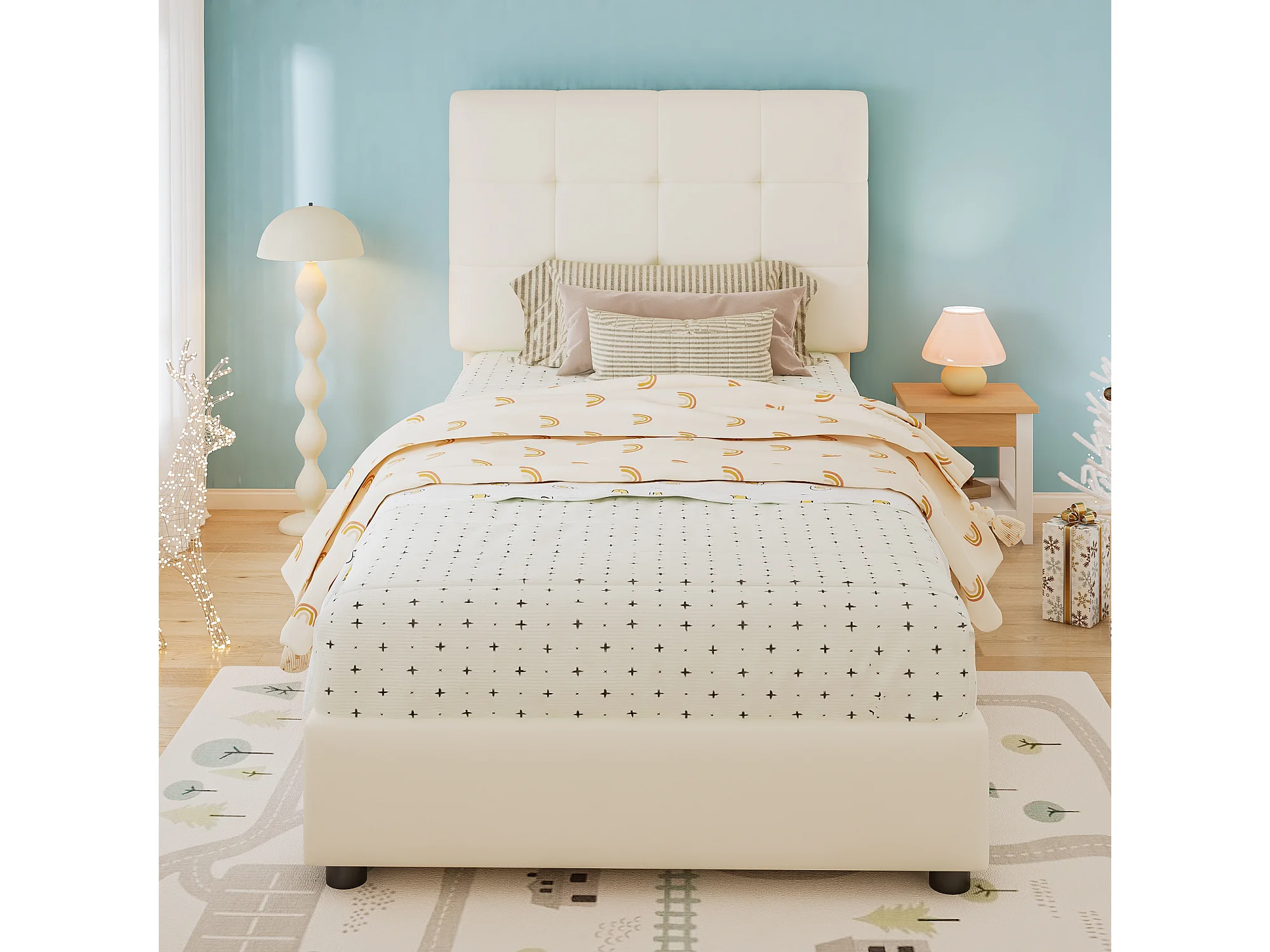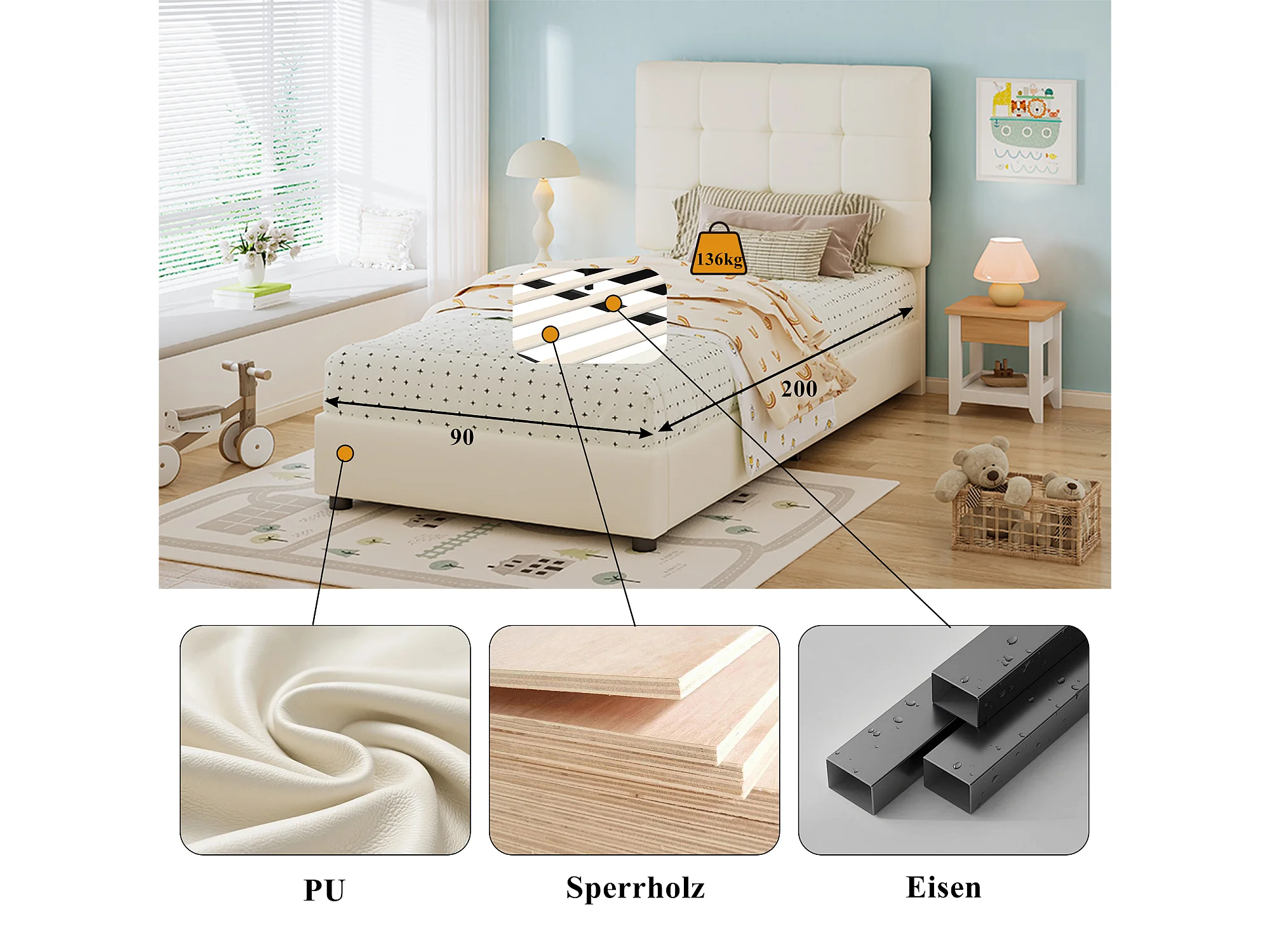 Lit capitonné simple pour enfant - 90 x 200 cm - avec tête de lit et dossier moelleux - PU + fer + mousse + contreplaqué - beige