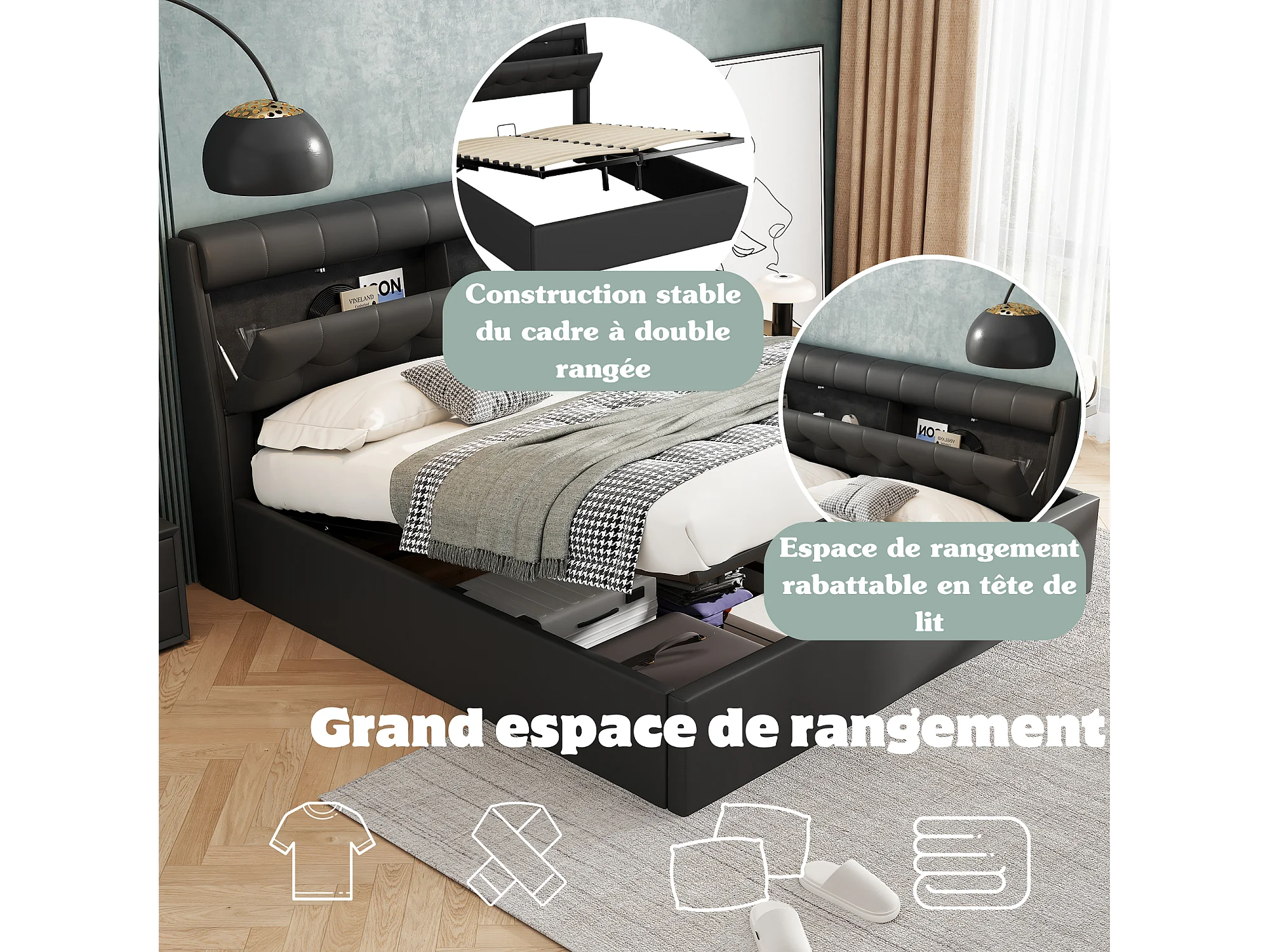 Lit coffre 140 x 190 cm avec tête de lit rangement - LEDs - Cuir PU - Noir (sans matelas)