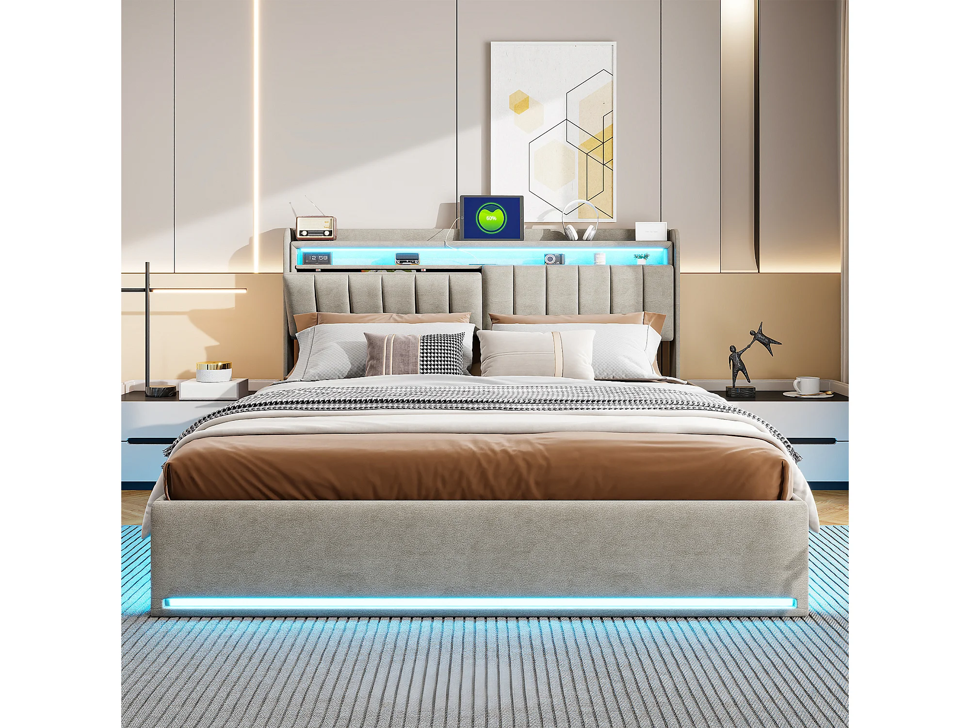 Lit Coffre 140 x 200 cm, Lit Double avec éclairage LED et Charge USB, Lit Rembourré pour Adultes et Adolescents, Velours, Gris