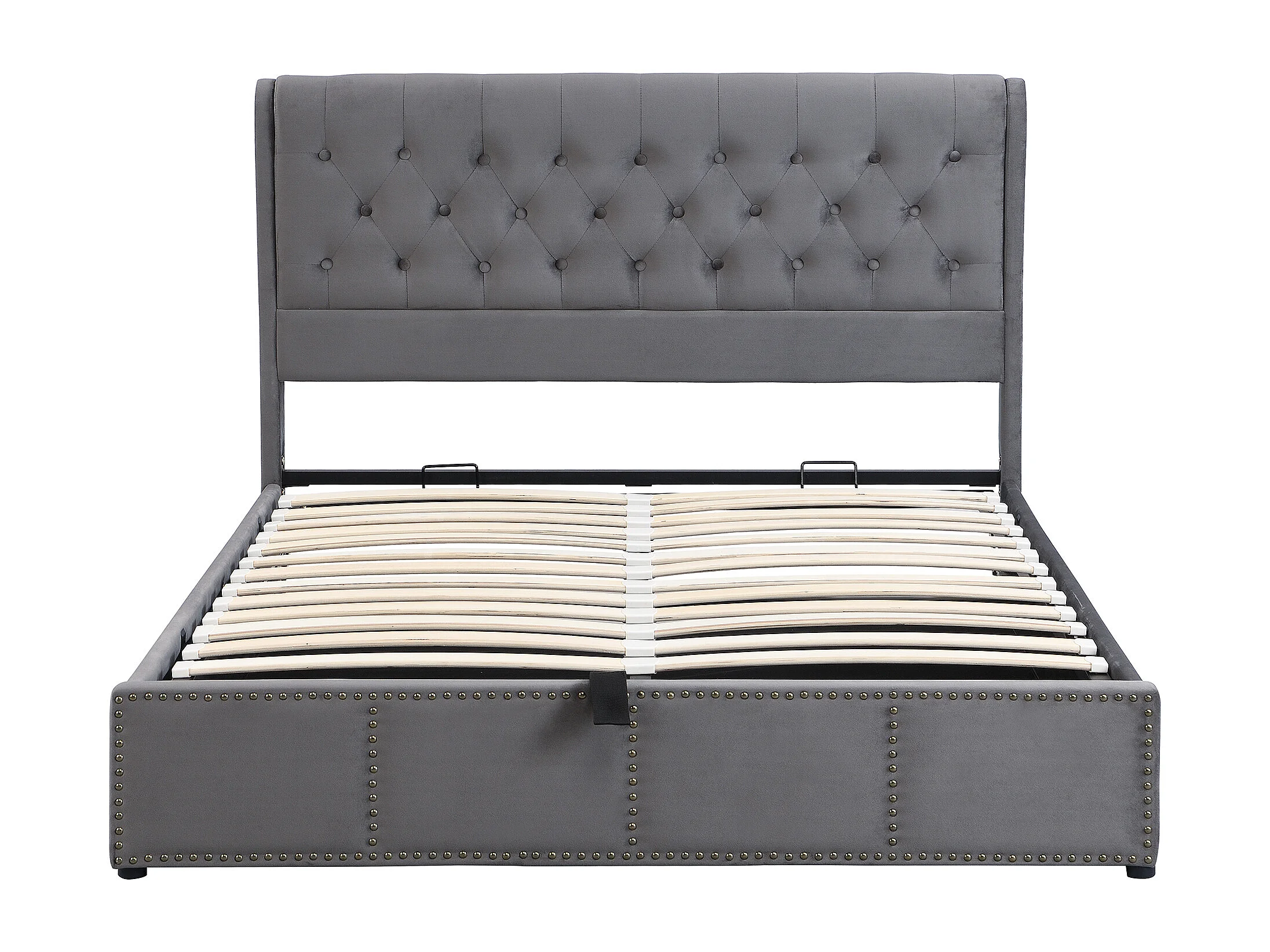 Lit coffre 140x190 cm, avec tête de lit rembourrée et rangement, détails cloutés, velours gris (Sans matelas)