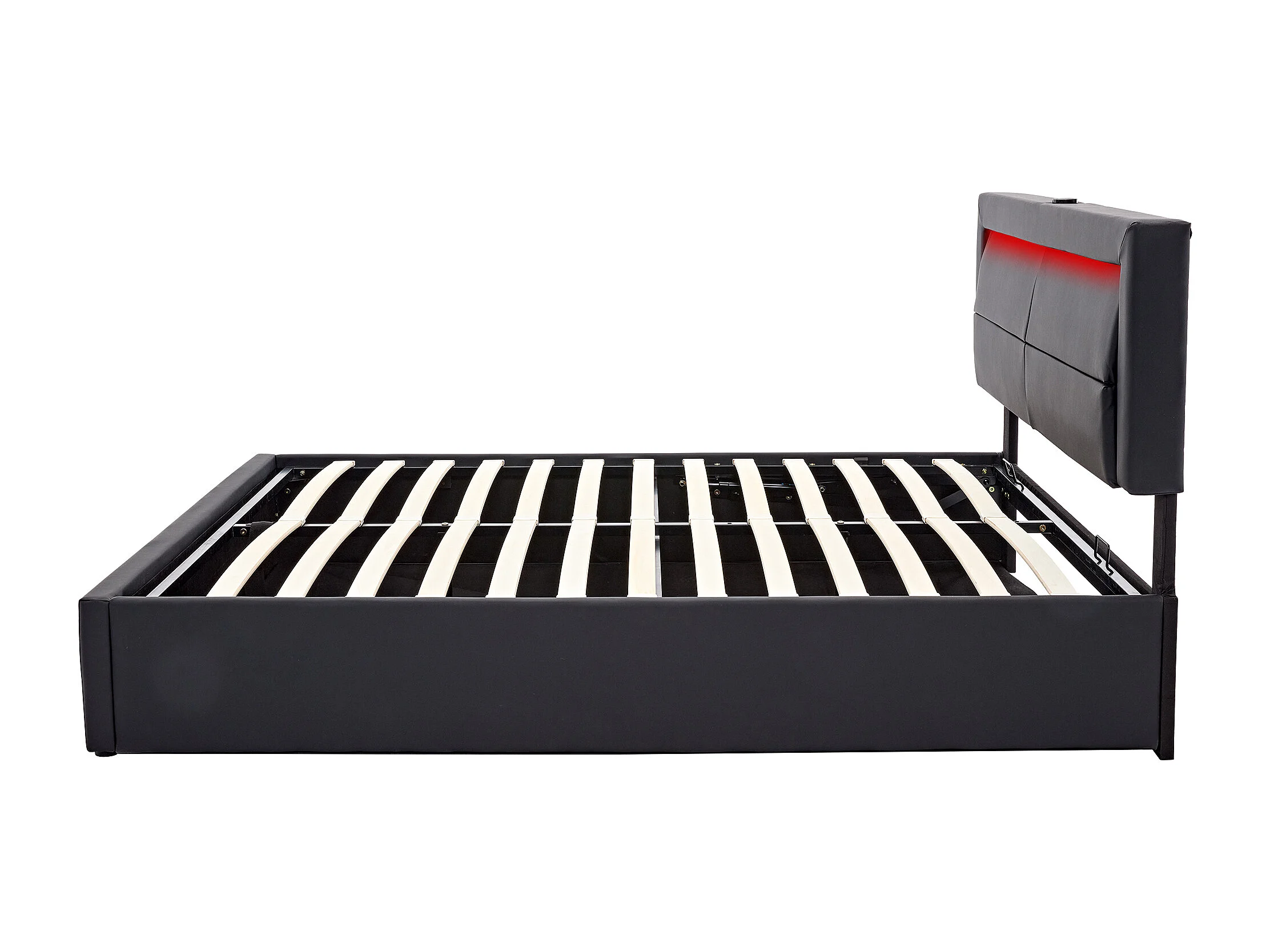 Lit coffre 140x190 cm avec LED et rangement, recharge USB sans fil et filaire, PU noir (Sans matelas)