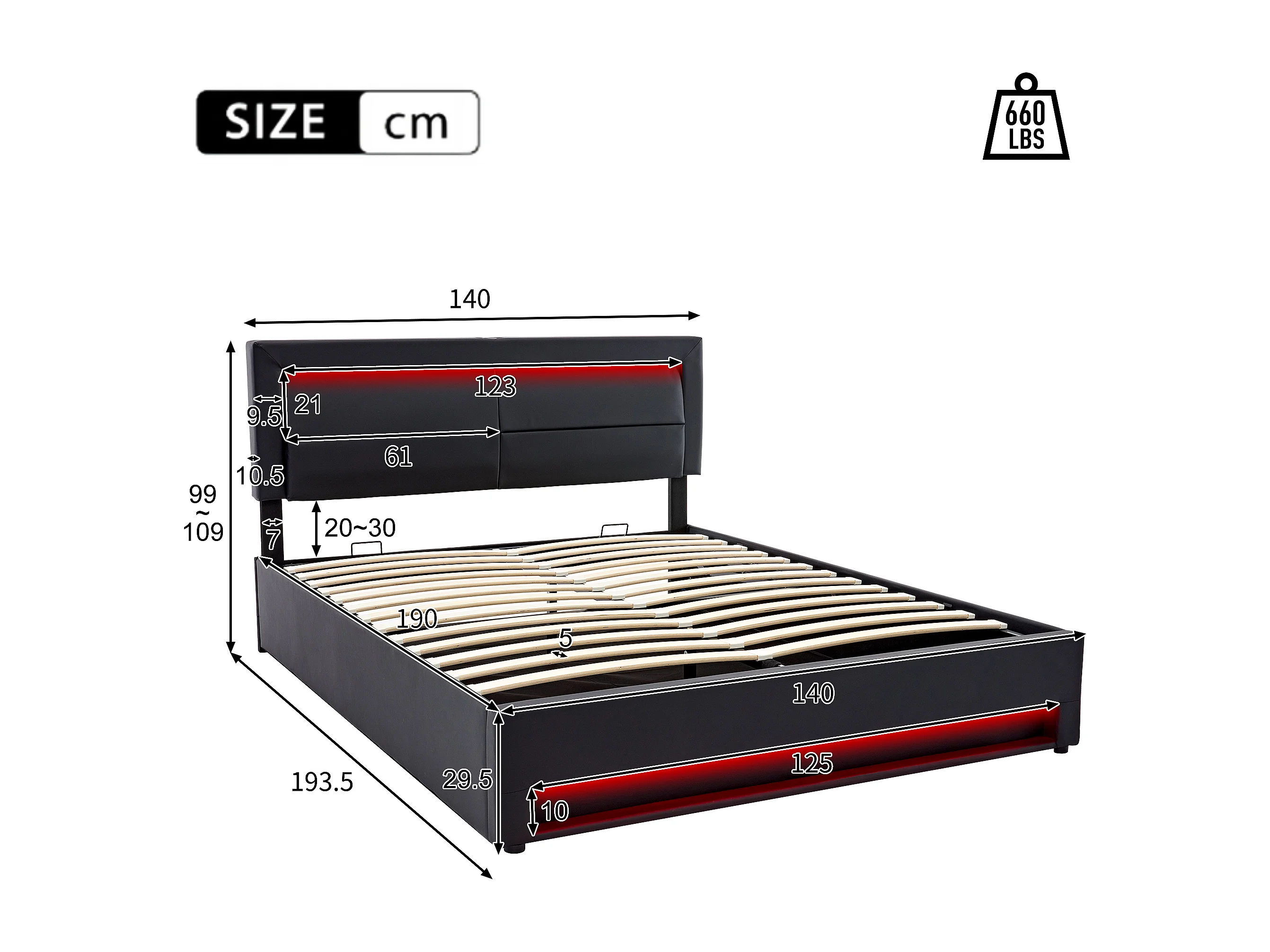Lit coffre 140x190 cm avec sommier - tête de lit capitonnée avec LED et USB - similicuir - noir (sans matelas)