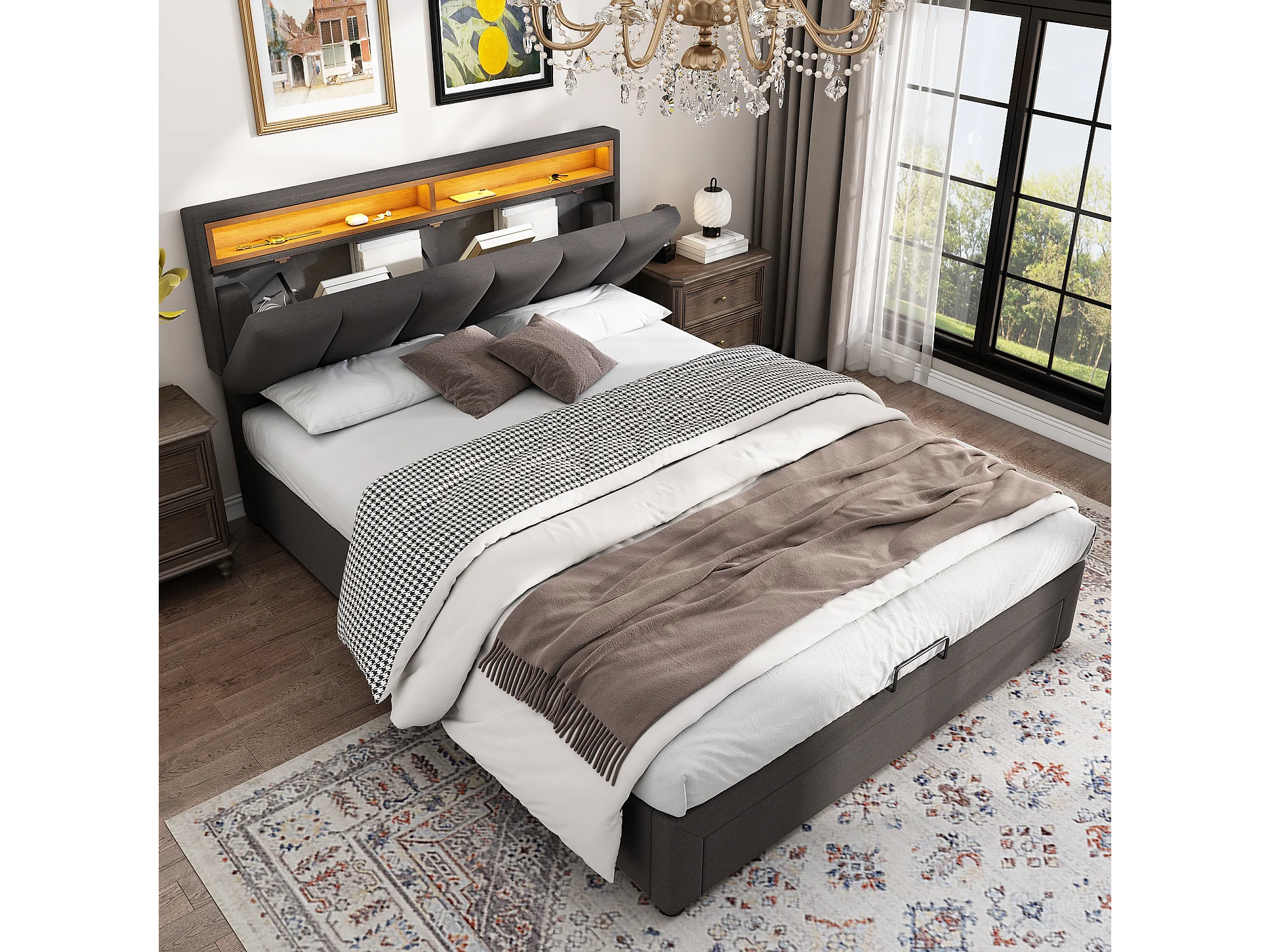 Lit coffre 140x190 cm avec LED, avec sommier et rangement sous le lit, acier et lin gris (Sans matelas)