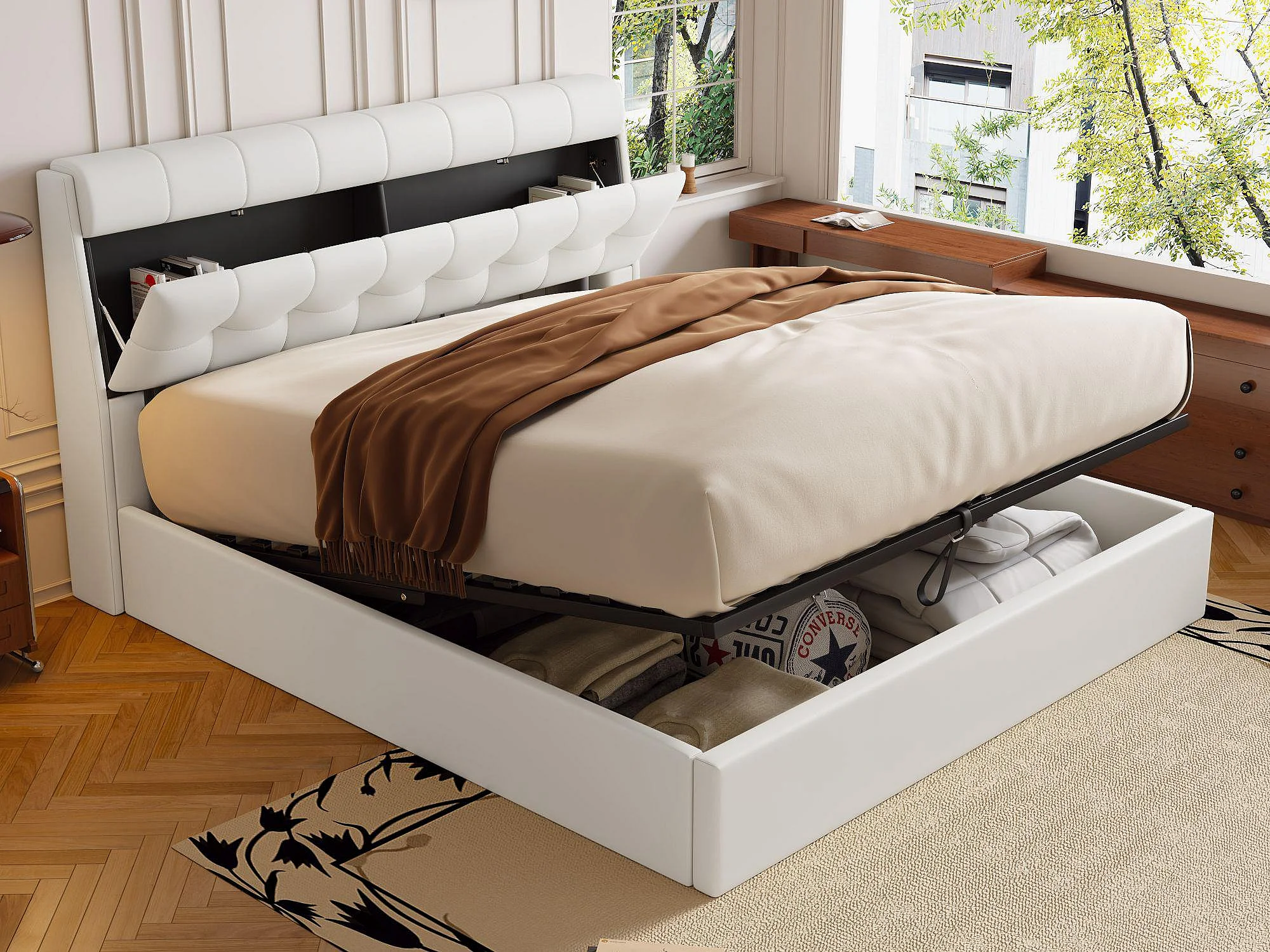 Lit coffre 140x190 cm - en similicuir - tête de lit avec rangement - Blanc