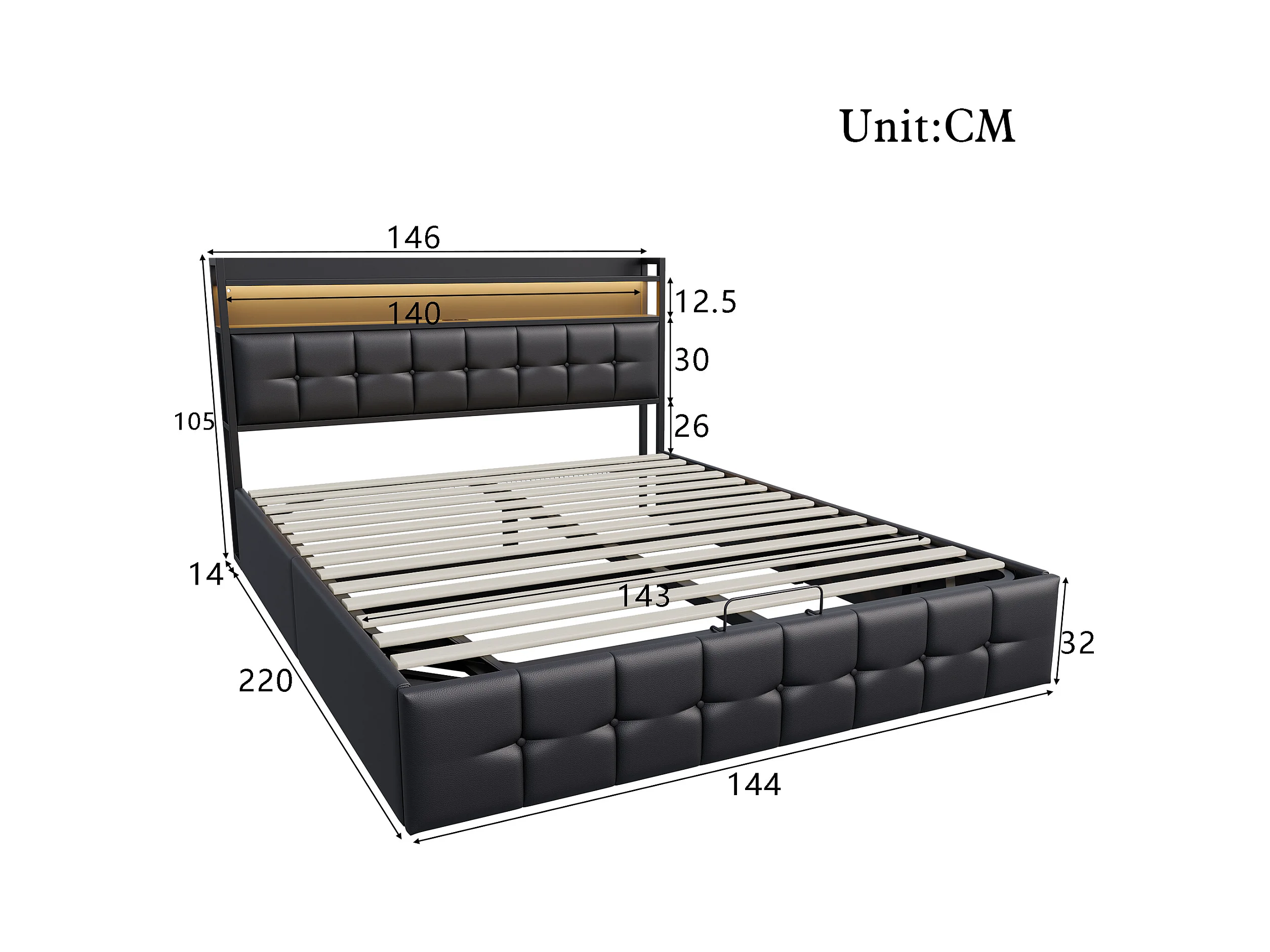 Lit Coffre 140x200 cm, avec Rangement, avec USB et éclairage LED, avec sommier à Lattes, PU, Noir