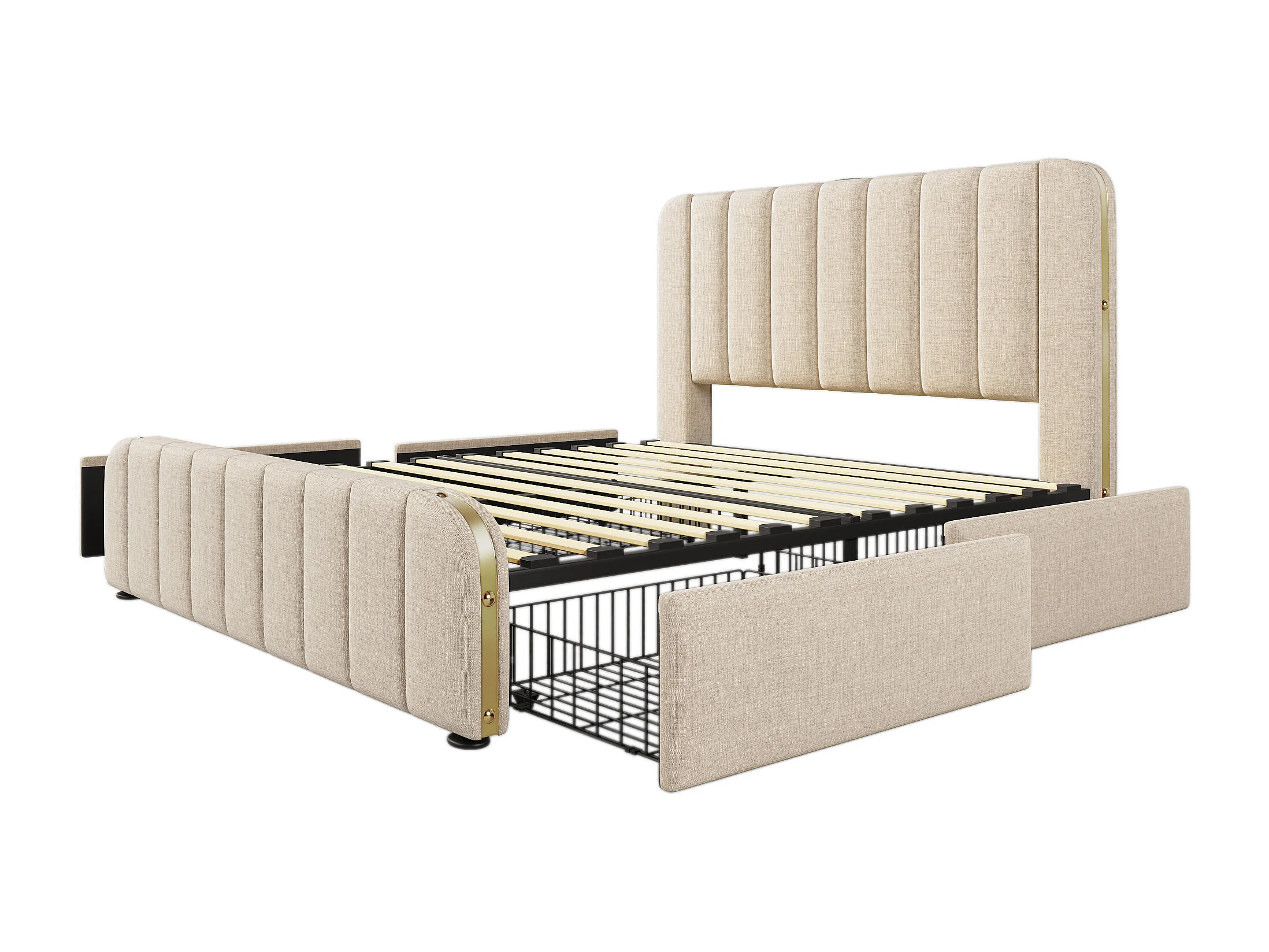 Lit coffre 140x200 cm avec sommier - tête de lit capitonnée avec USB et 4 tiroirs - tissu lin - beige (sans matelas)