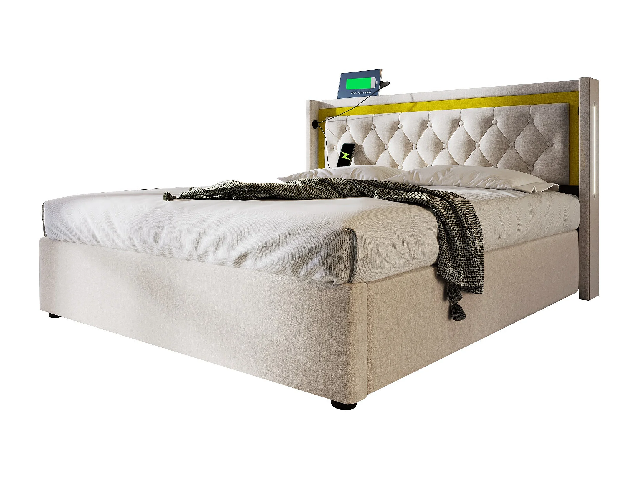 Lit coffre 140x200 cm avec sommier - tête de lit capitonnée avec USB et LED - coton - beige (sans matelas)