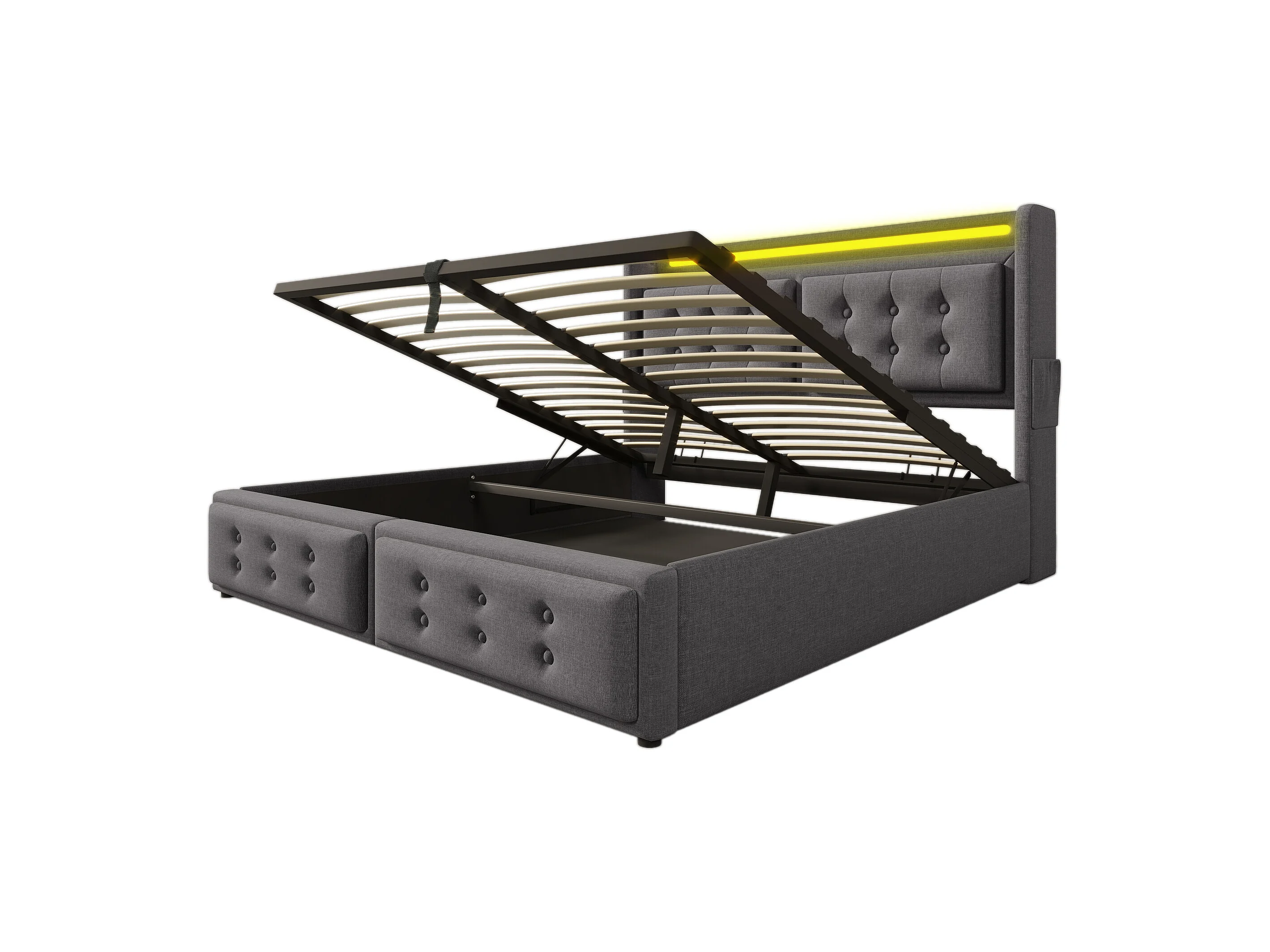 Lit coffre 140x200 cm avec sommier - tête de lit capitonnée avec USB et LED - coton et lin - gris (sans matelas)