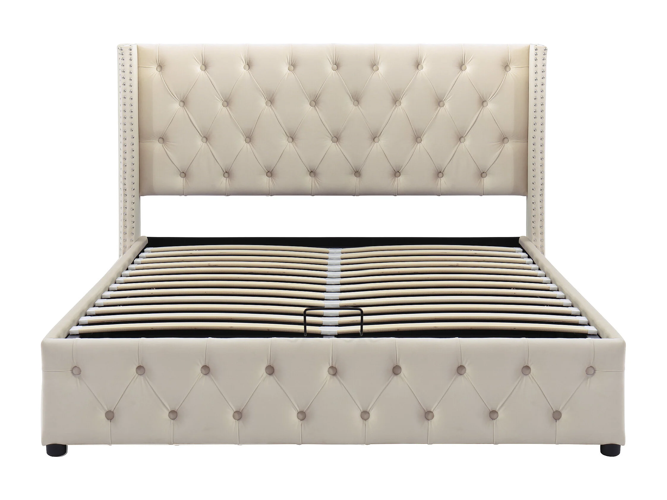 Lit coffre 140x200 cm avec rangement hydraulique, tête de lit capitonnée, velours beige (Sans matelas)