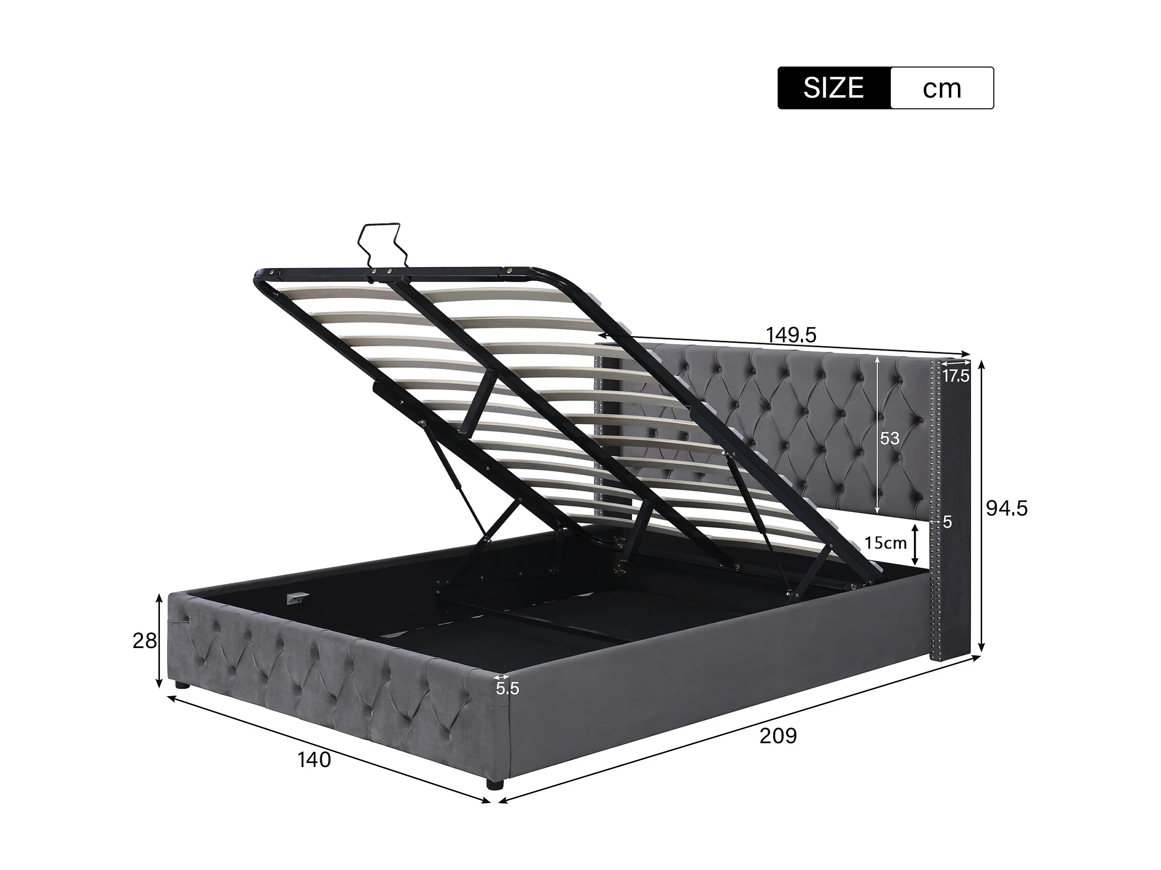 Lit coffre 140x200 cm avec sommier - tête de lit capitonnée - velours - gris (sans matelas)