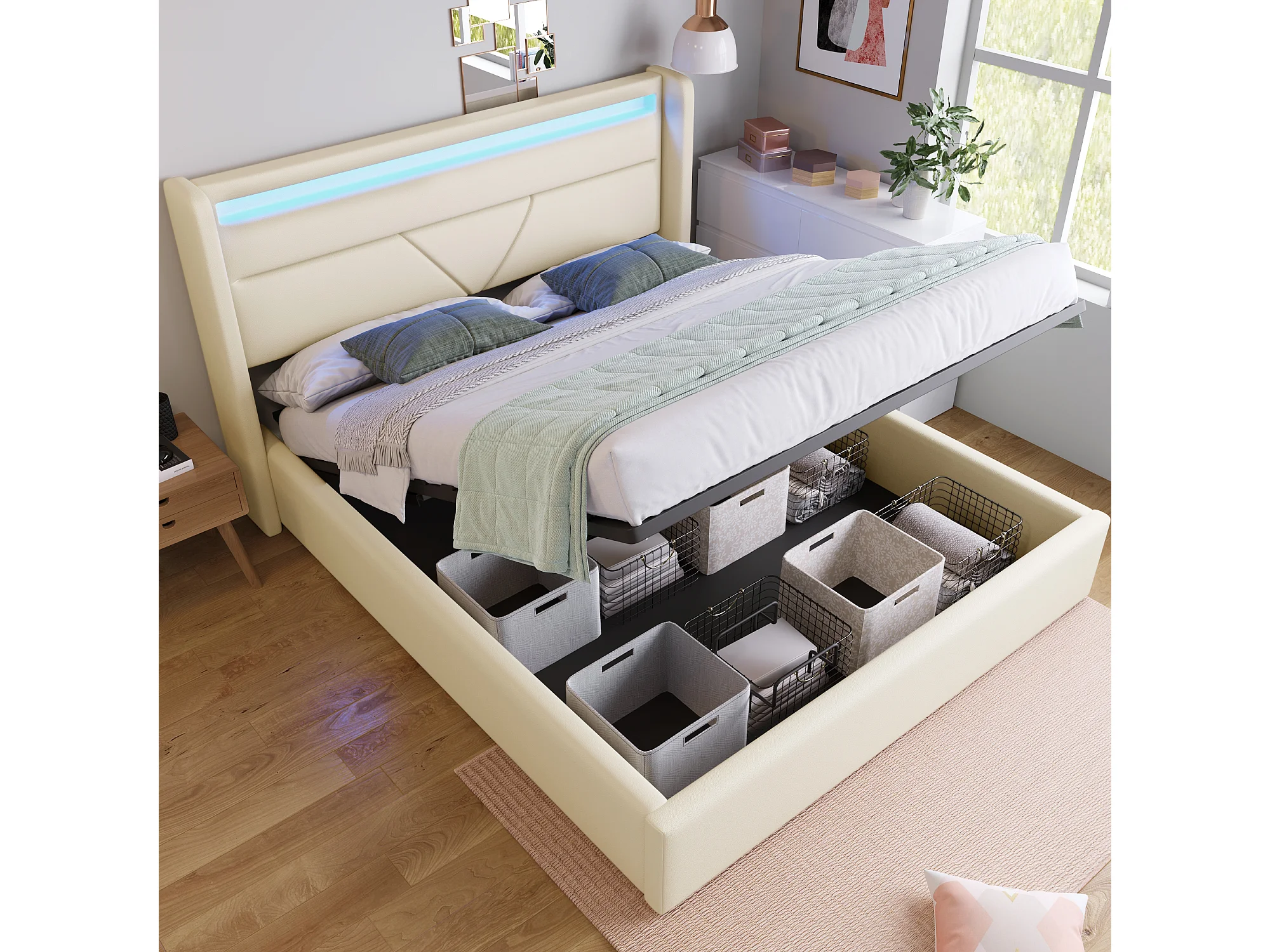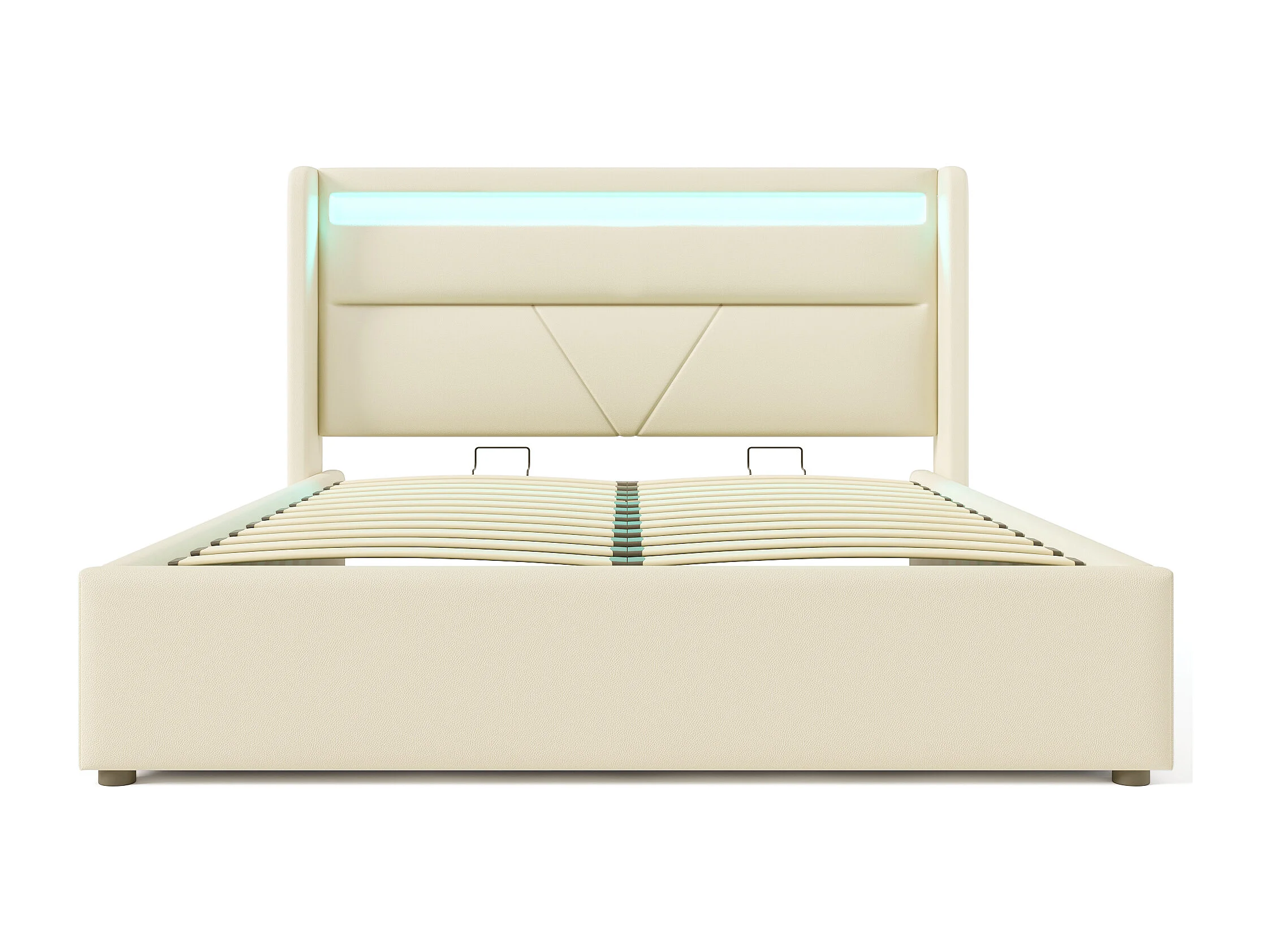 Lit coffre 140x200 cm avec LED et télécommande, rangement hydraulique, PU blanc (Sans matelas)