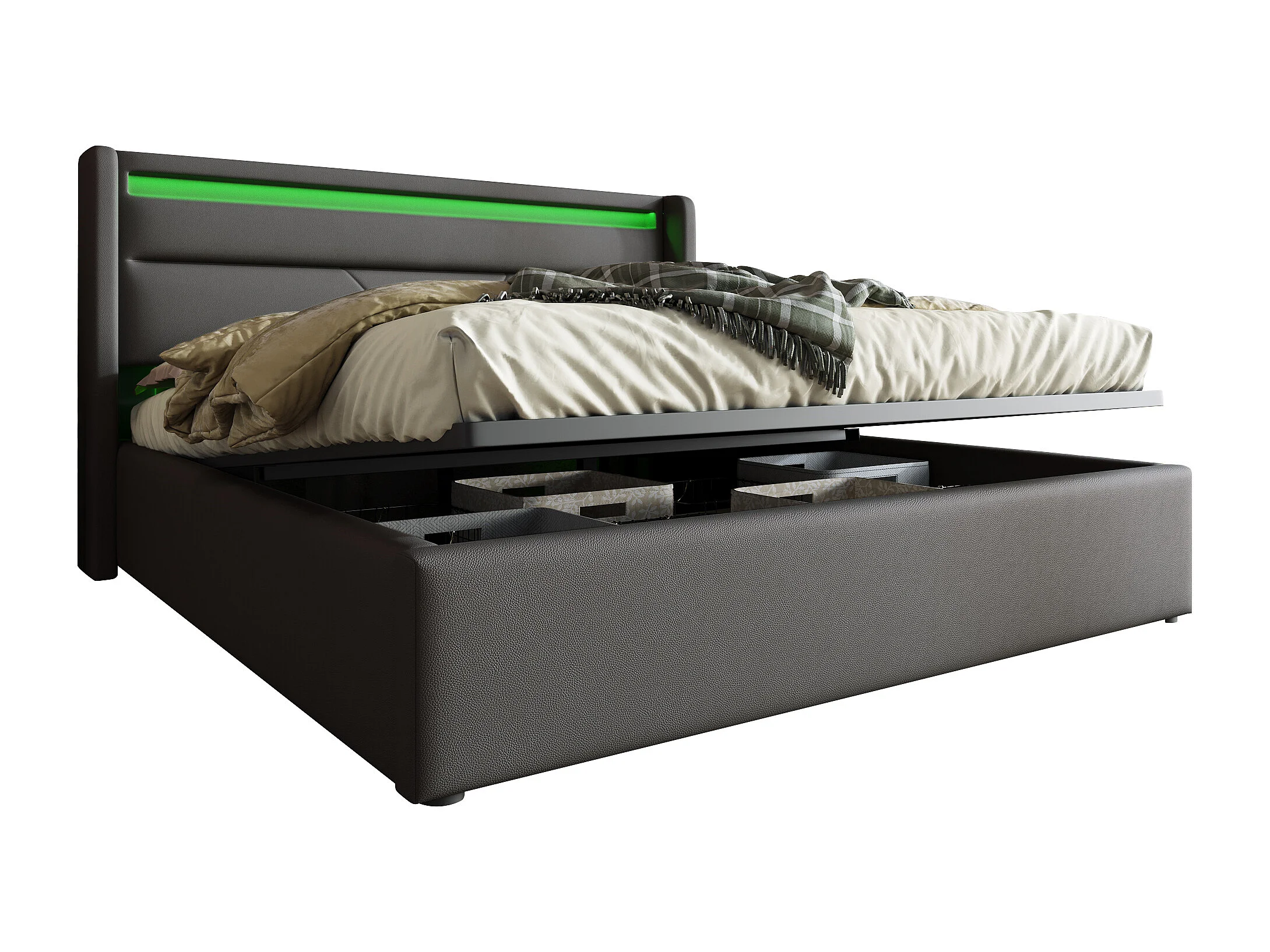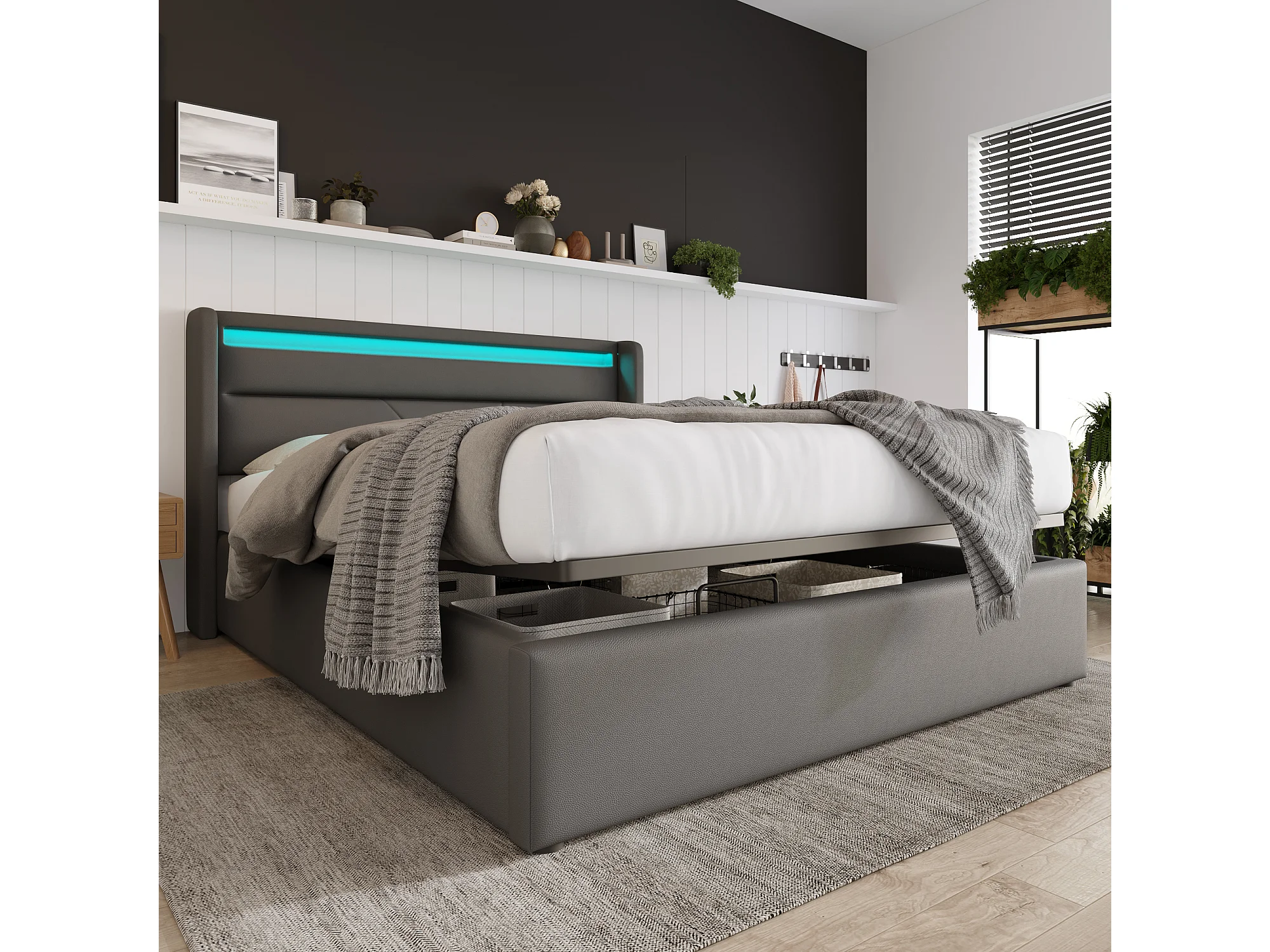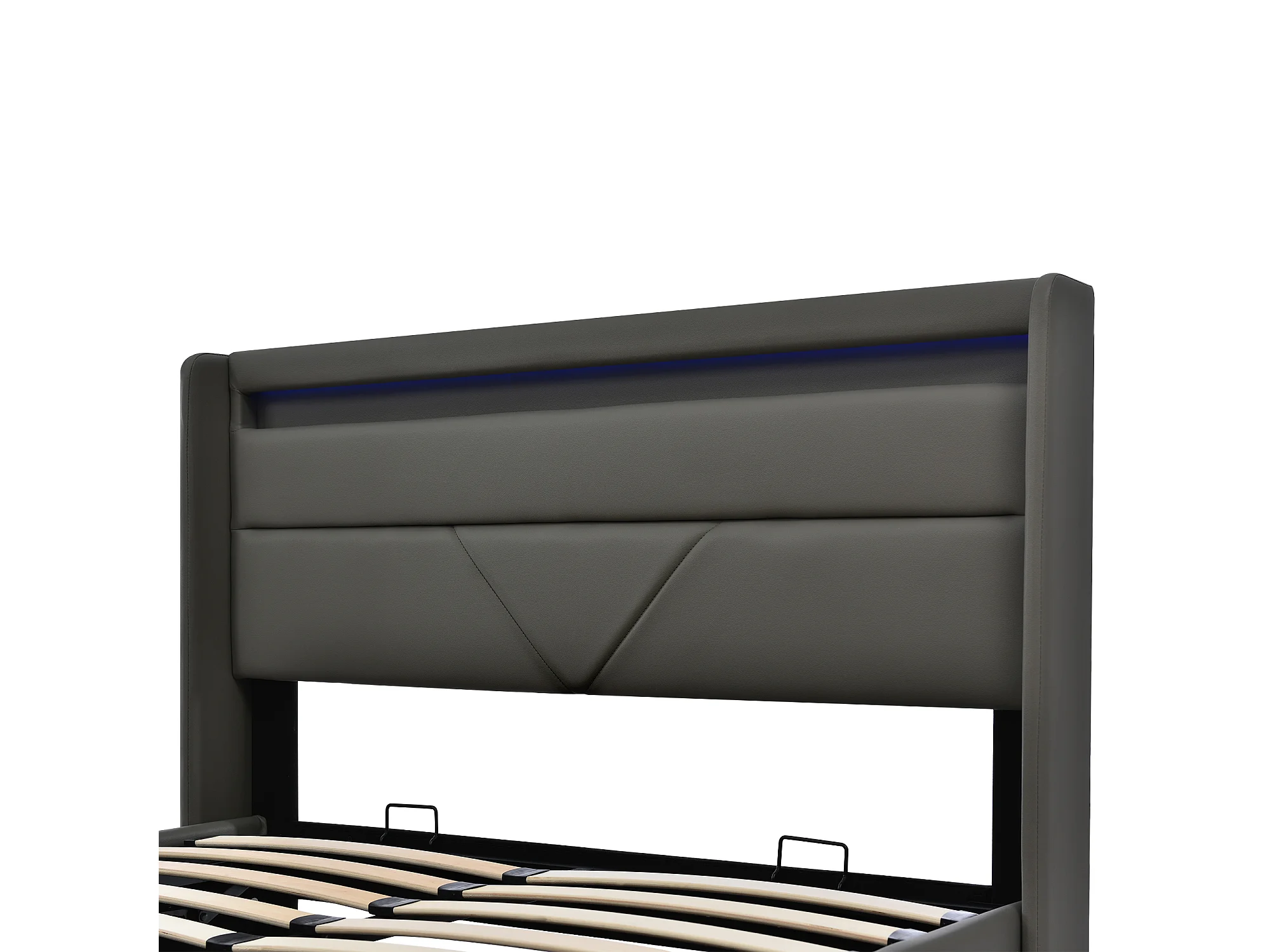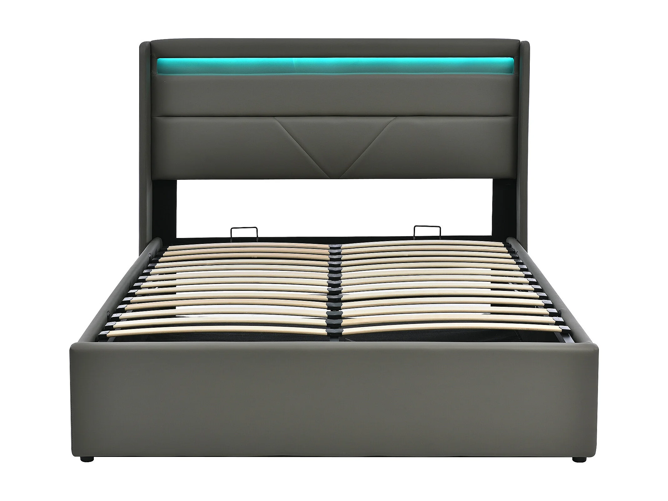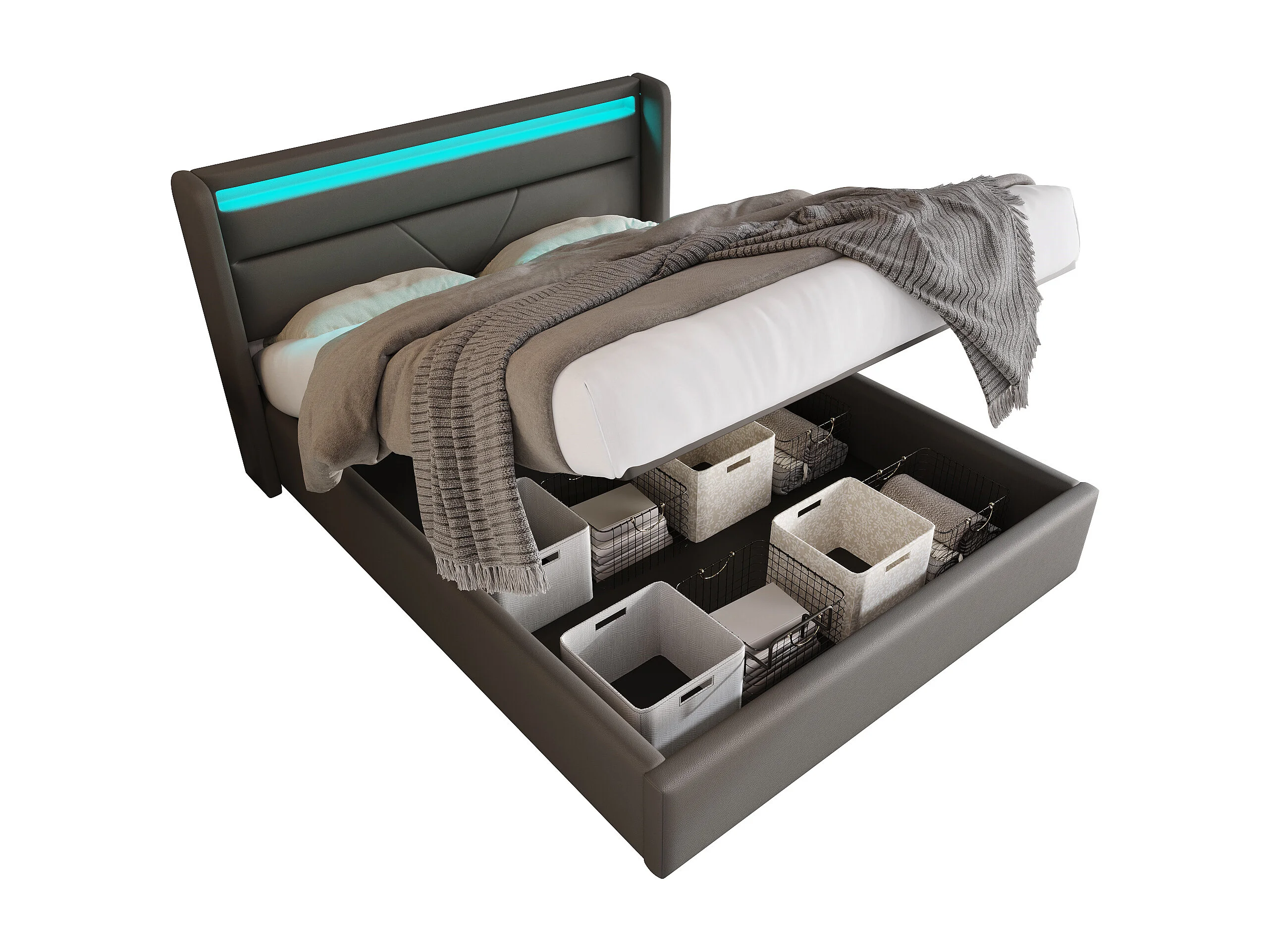 Lit coffre 140x200 cm avec éclairage LED et télécommande, avec sommier relevable hydraulique, PU gris (Sans matelas)