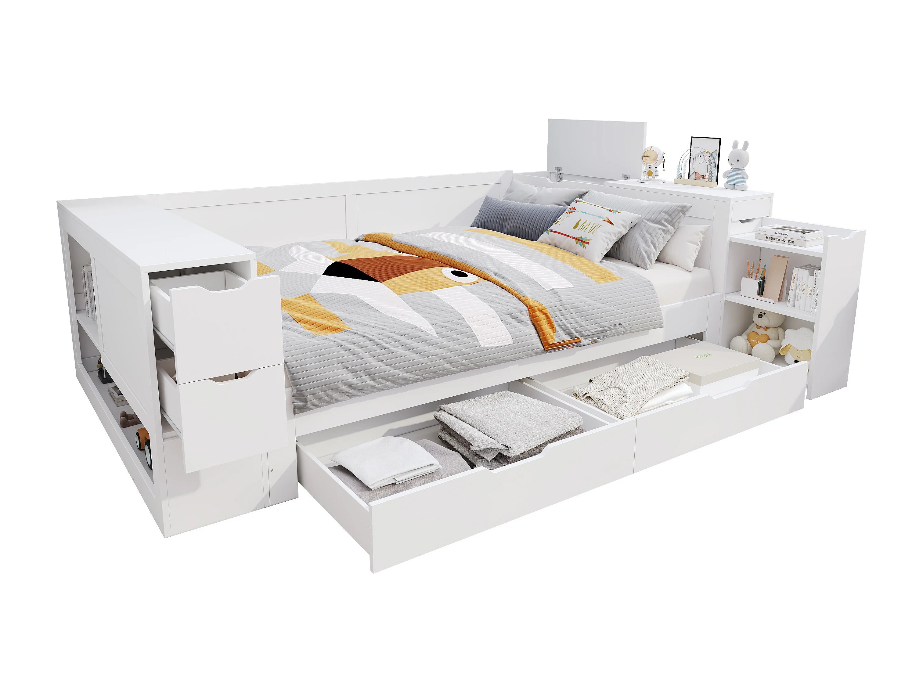 Lit coffre 140×200 cm blanc, bois MDF, avec tiroirs, étagères, armoires et tables de chevet, adapté aux adolescents