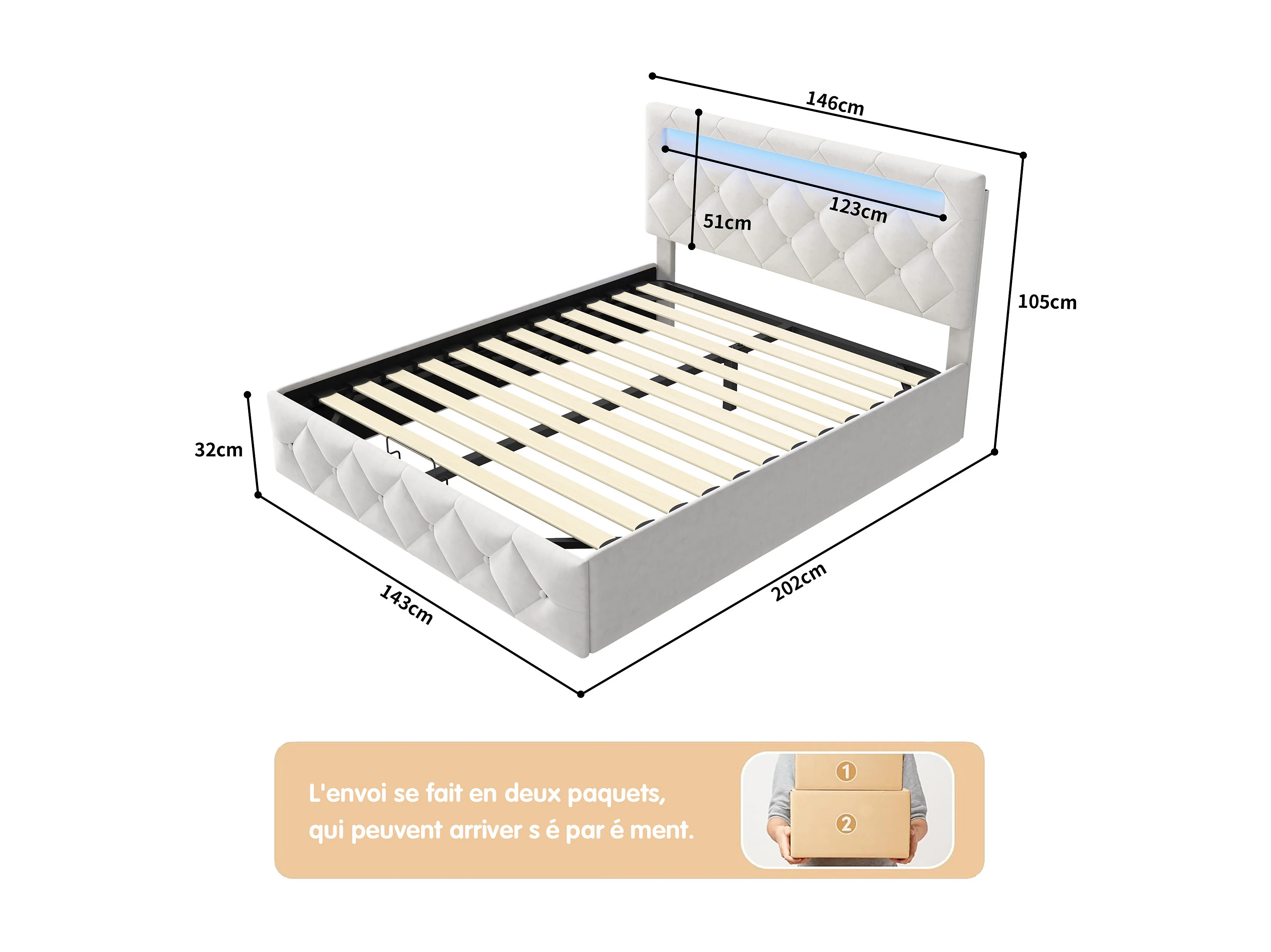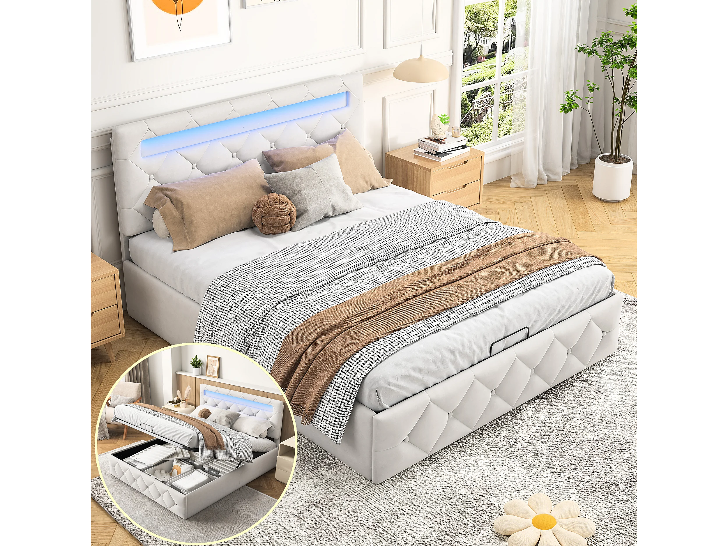 Lit coffre 140x200cm avec éclairage LED et rangement hydraulique - tête de lit réglable - velours - beige
