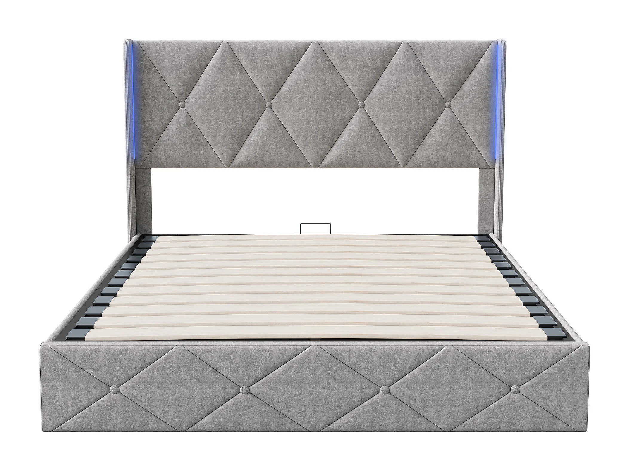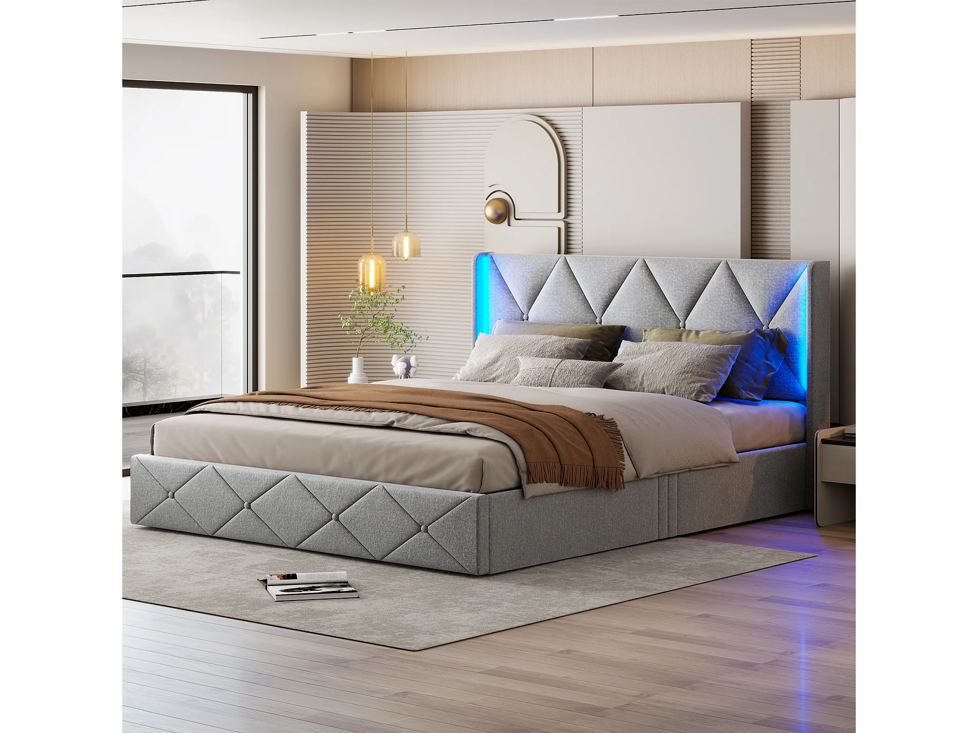 Lit coffre 140x200cm - avec espace de rangement hydraulique et sommier à lattes - tête de lit avec éclairage LED - gris