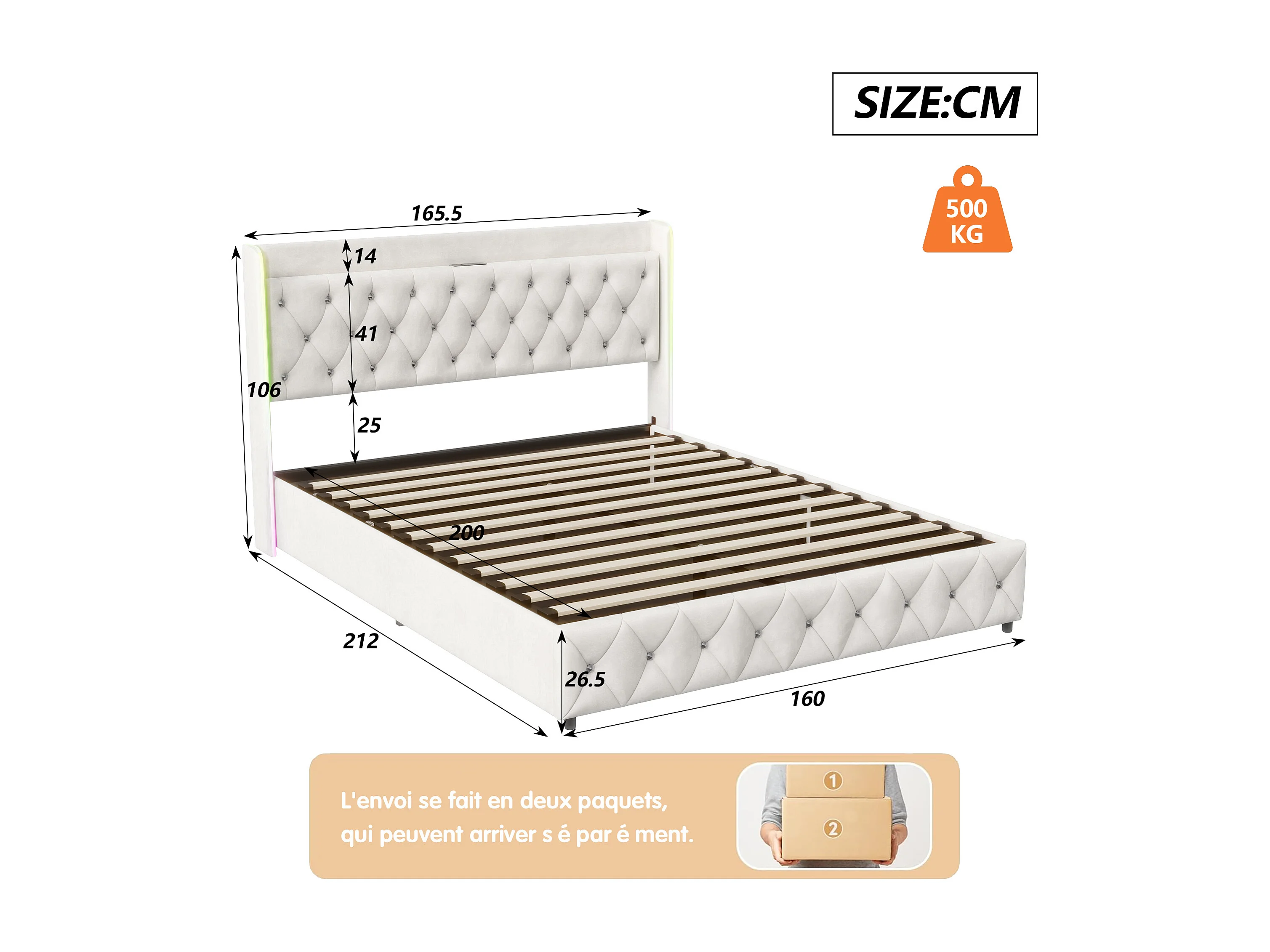 Lit Coffre 160 x 200 cm, avec éclairage LED et Charge USB, Lit Double Rembourré avec Rangement et Tete de lit, Velours, Blanc