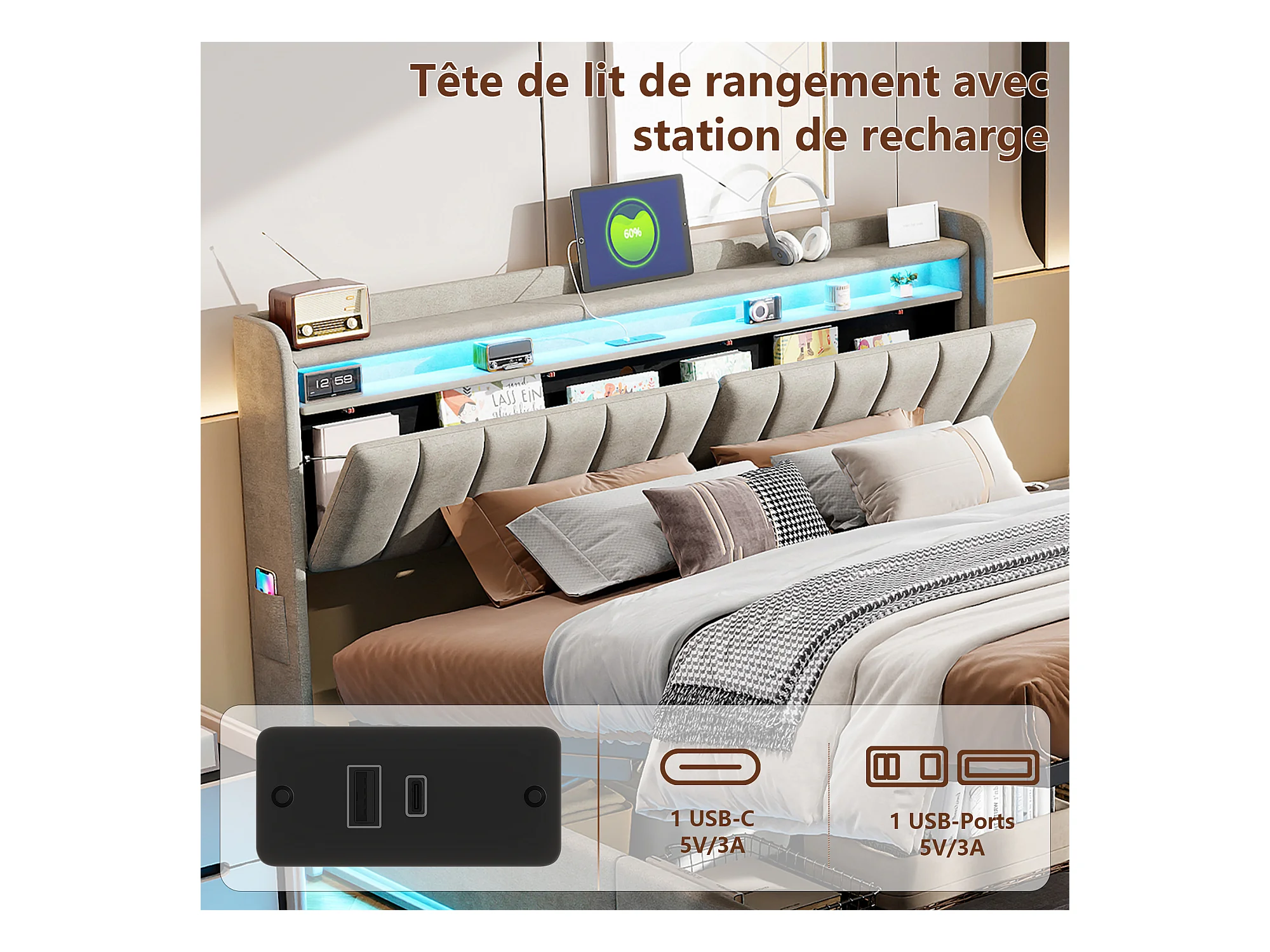 Lit Coffre 160 x 200 cm, Lit Double Rembourré avec LED et Charge USB, Sommier à Lattes, Velours,Gris