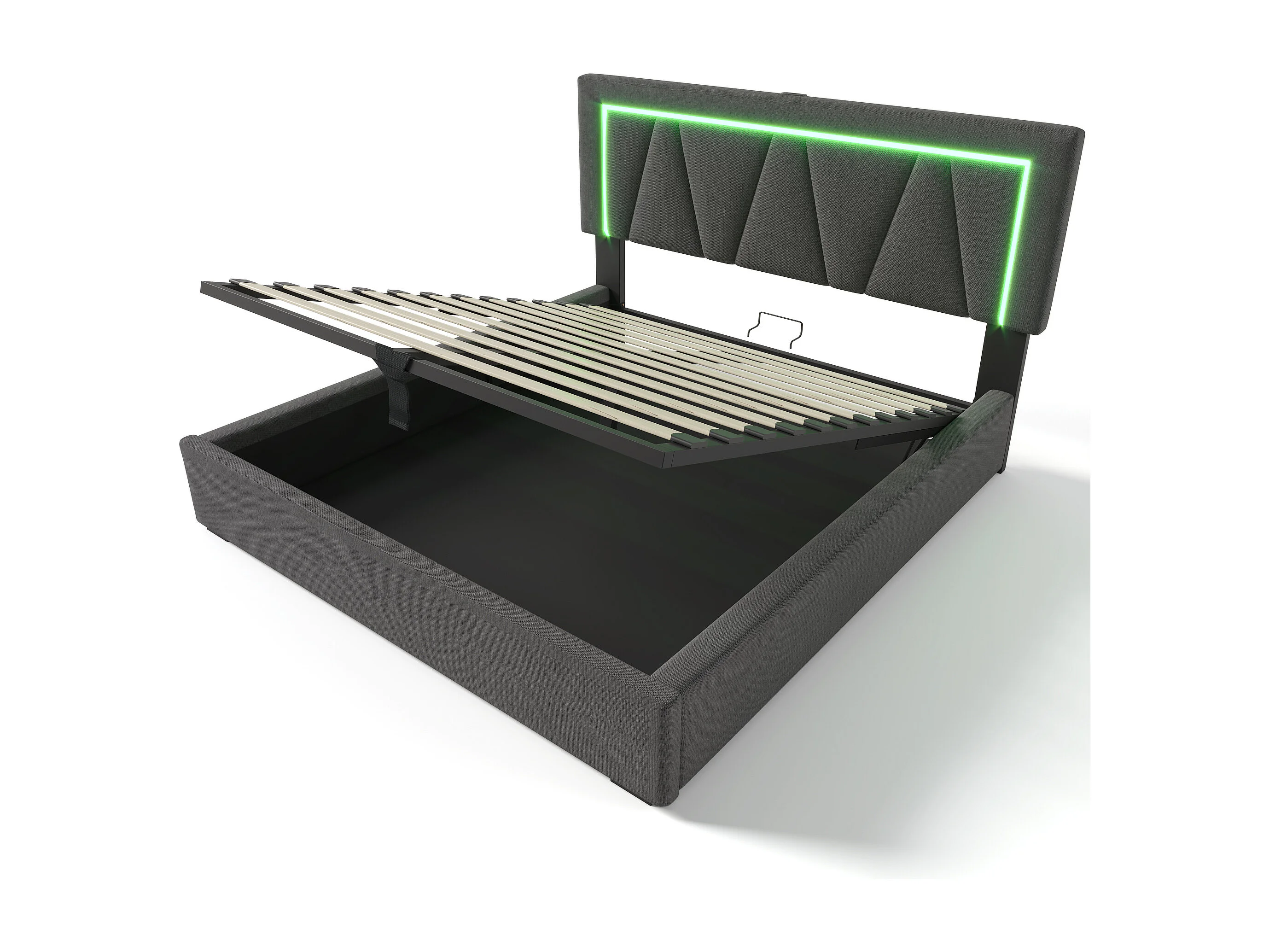 Lit coffre adulte 160x200cm avec LED et USB, prise secteur, tête de lit en lin gris, sans fond, avec matelas