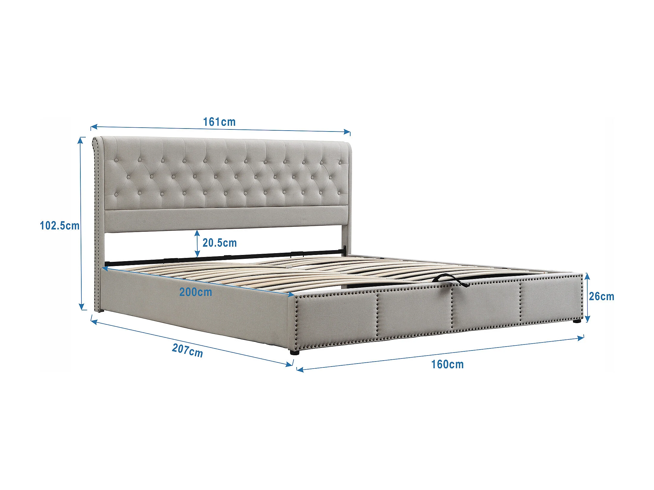 Lit coffre 160x200 cm, tête de lit rembourrée, rangement intégré, détails cloutés, lin gris (Sans matelas)