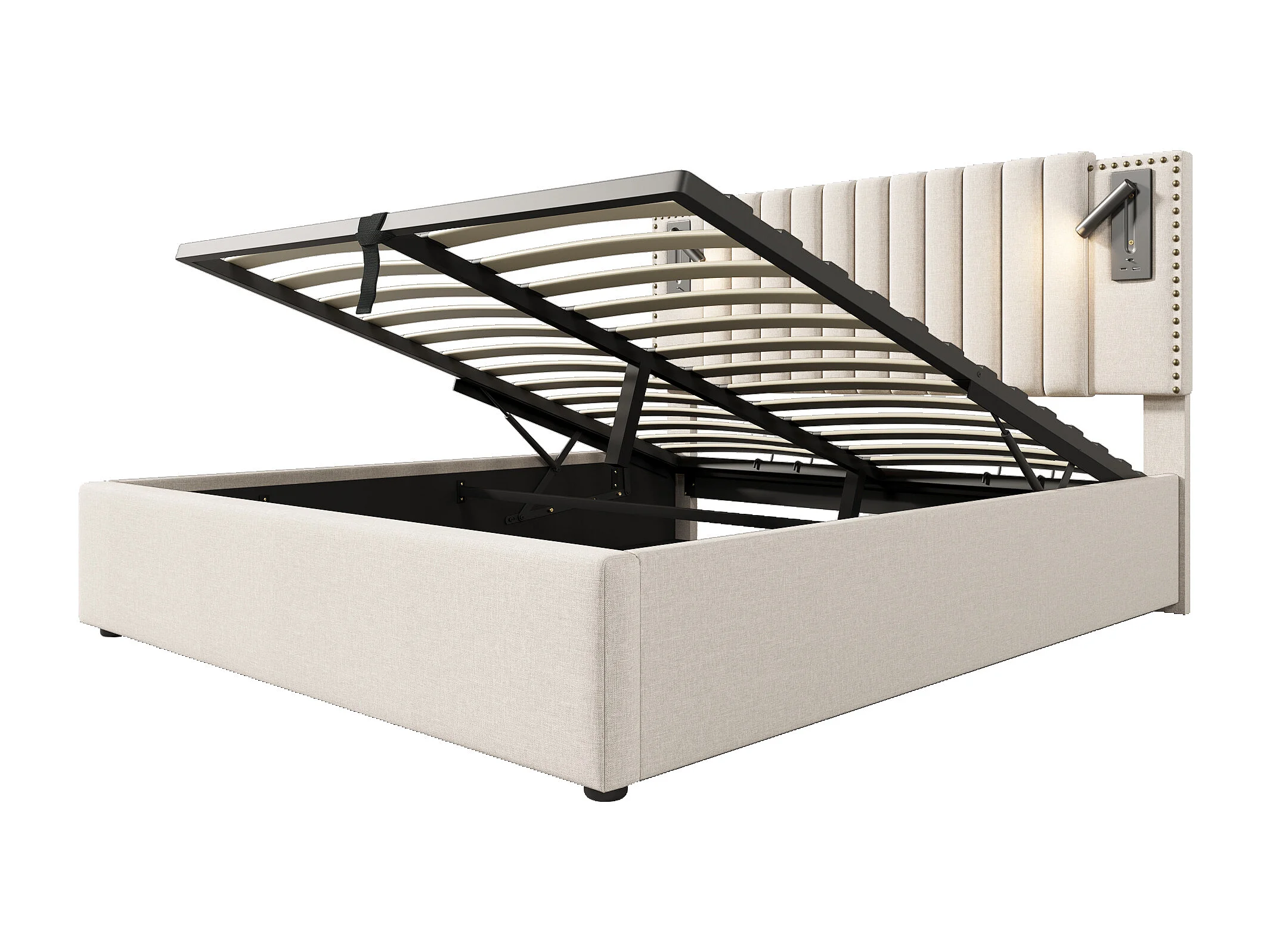Lit coffre 160x200 cm avec sommier - tête de lit avec USB et lumière de lecture - coton - beige (sans matelas)