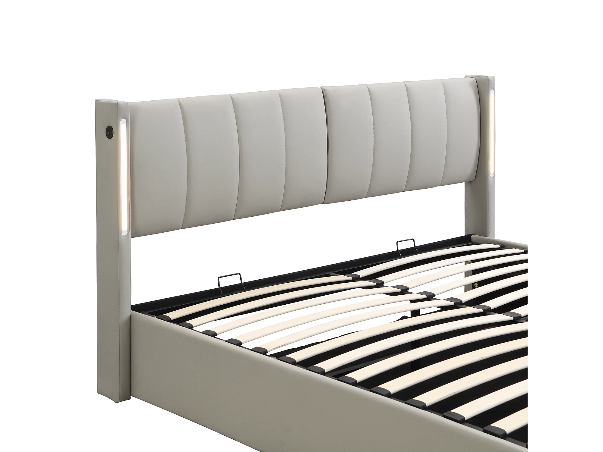 Lit coffre 160x200 cm avec sommier - tête de lit capitonnée avec LED et USB - similicuir - gris (sans matelas)