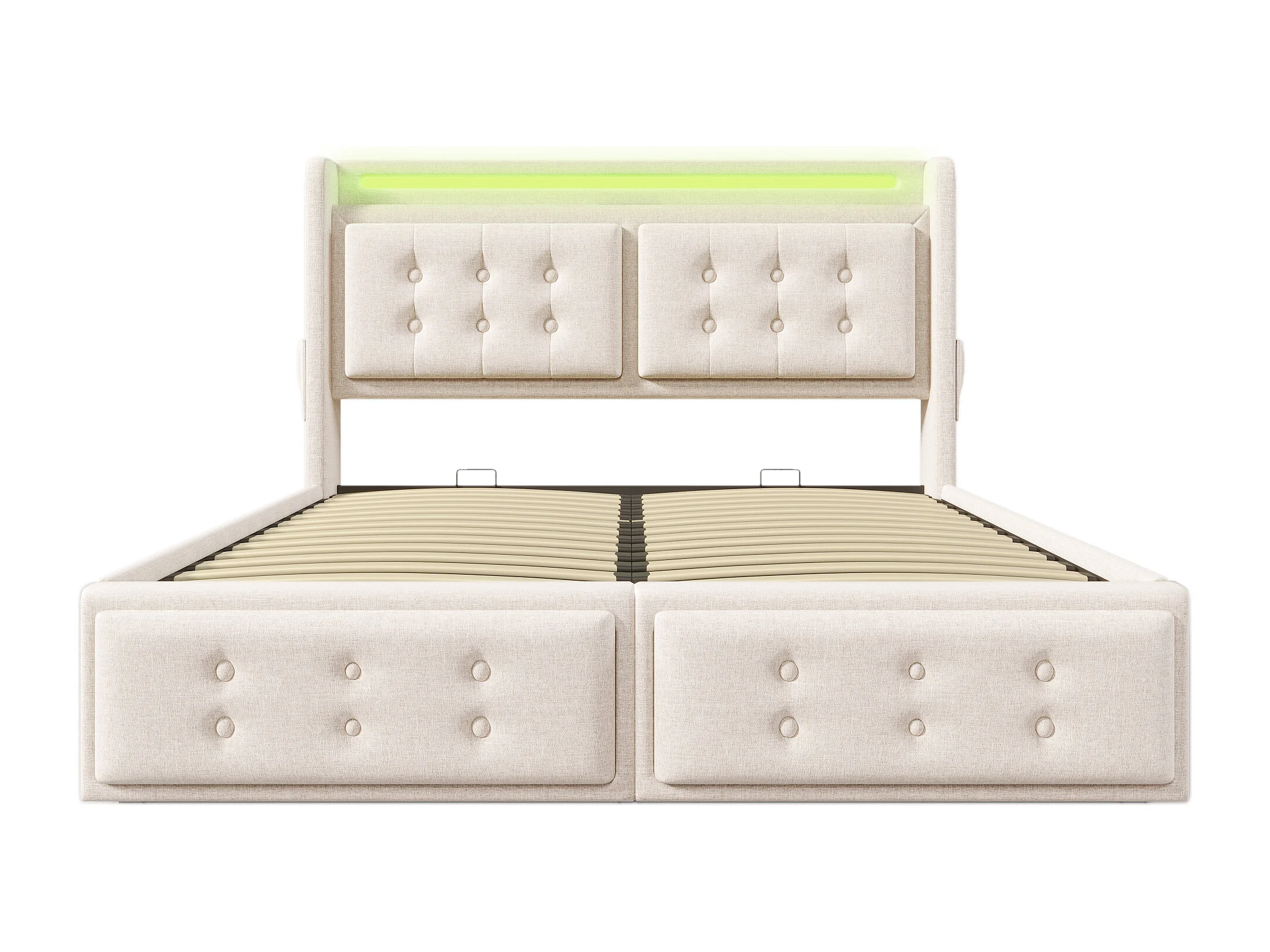 Lit coffre 160x200 cm avec sommier - tête de lit capitonnée avec USB et LED - coton et lin - beige (sans matelas)