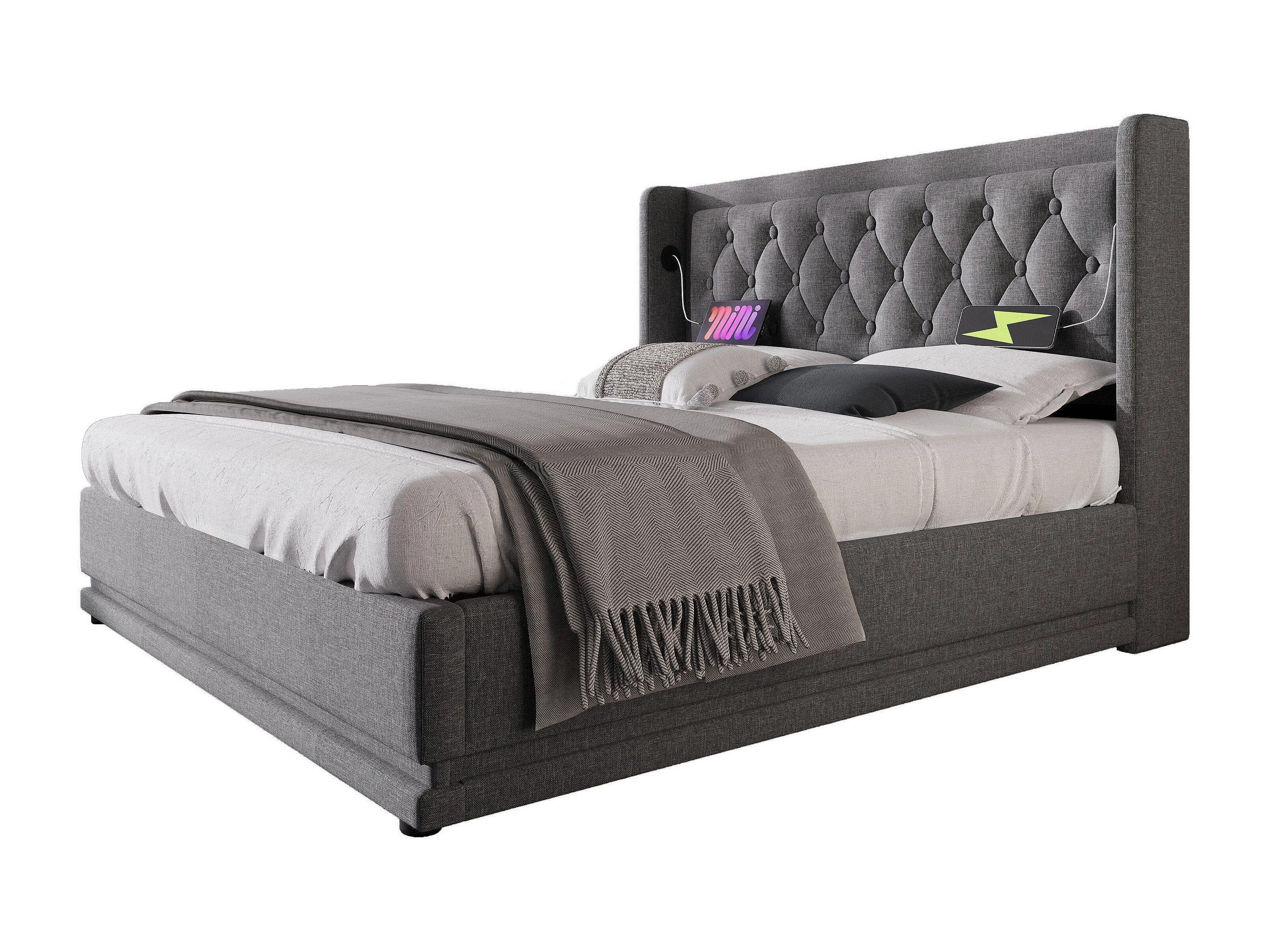 Lit coffre 160x200 cm avec sommier - tête de lit capitonnée avec USB et LED - coton - gris (sans matelas)