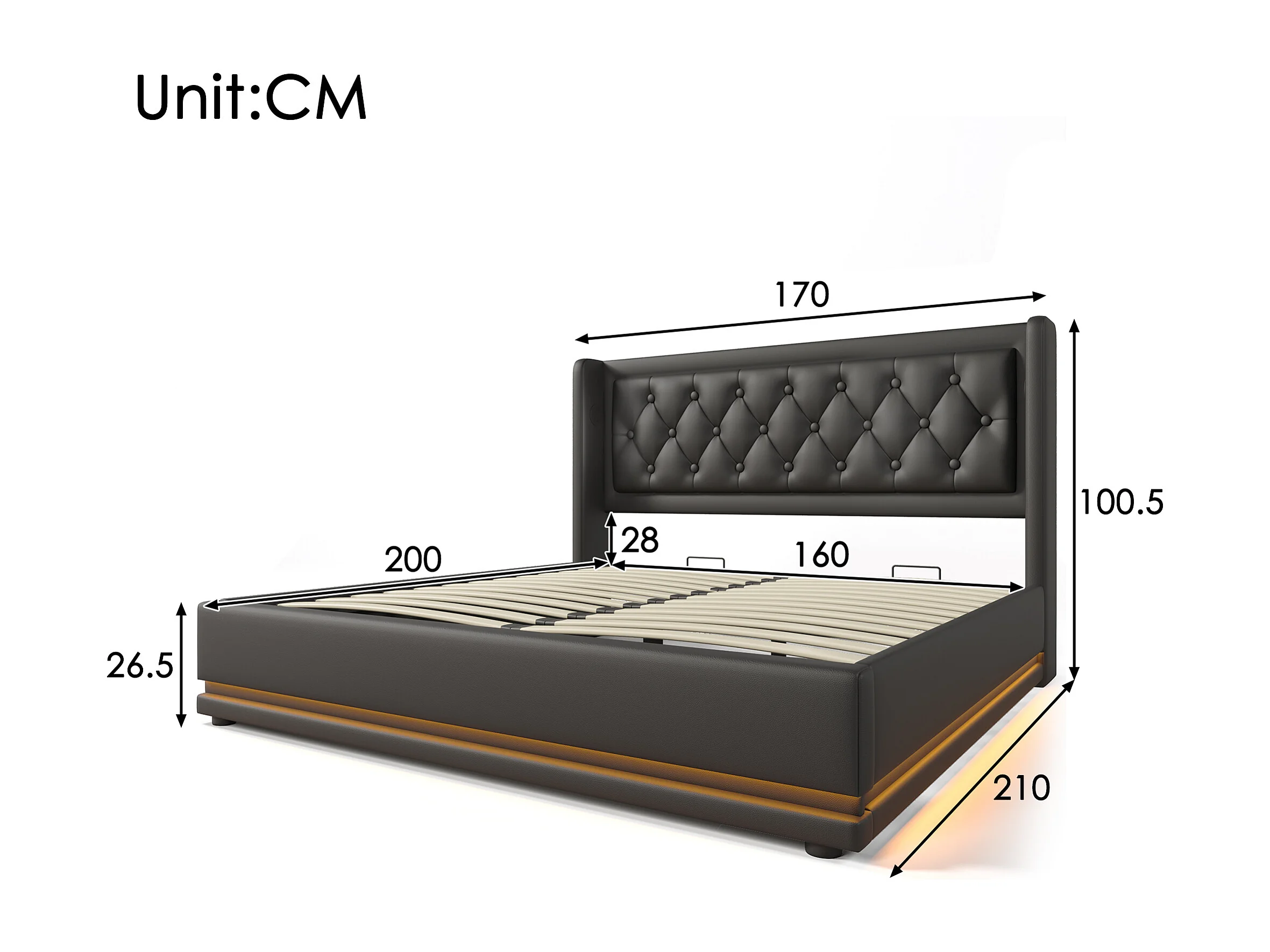 Lit coffre 160x200 cm, chargement USB et USB C, LED 3 côtés, revêtement PU noir (Sans matelas)