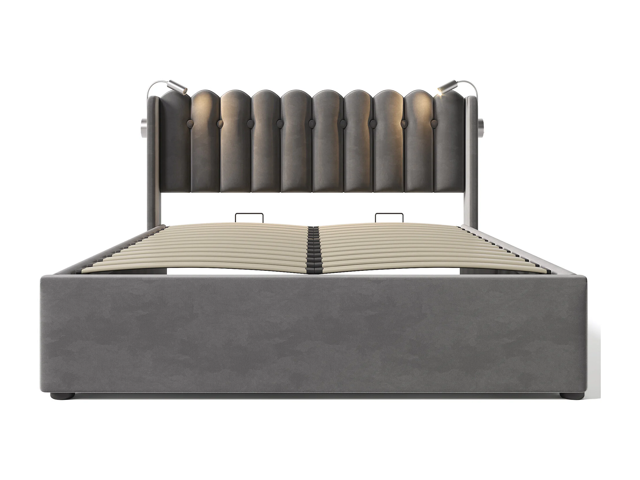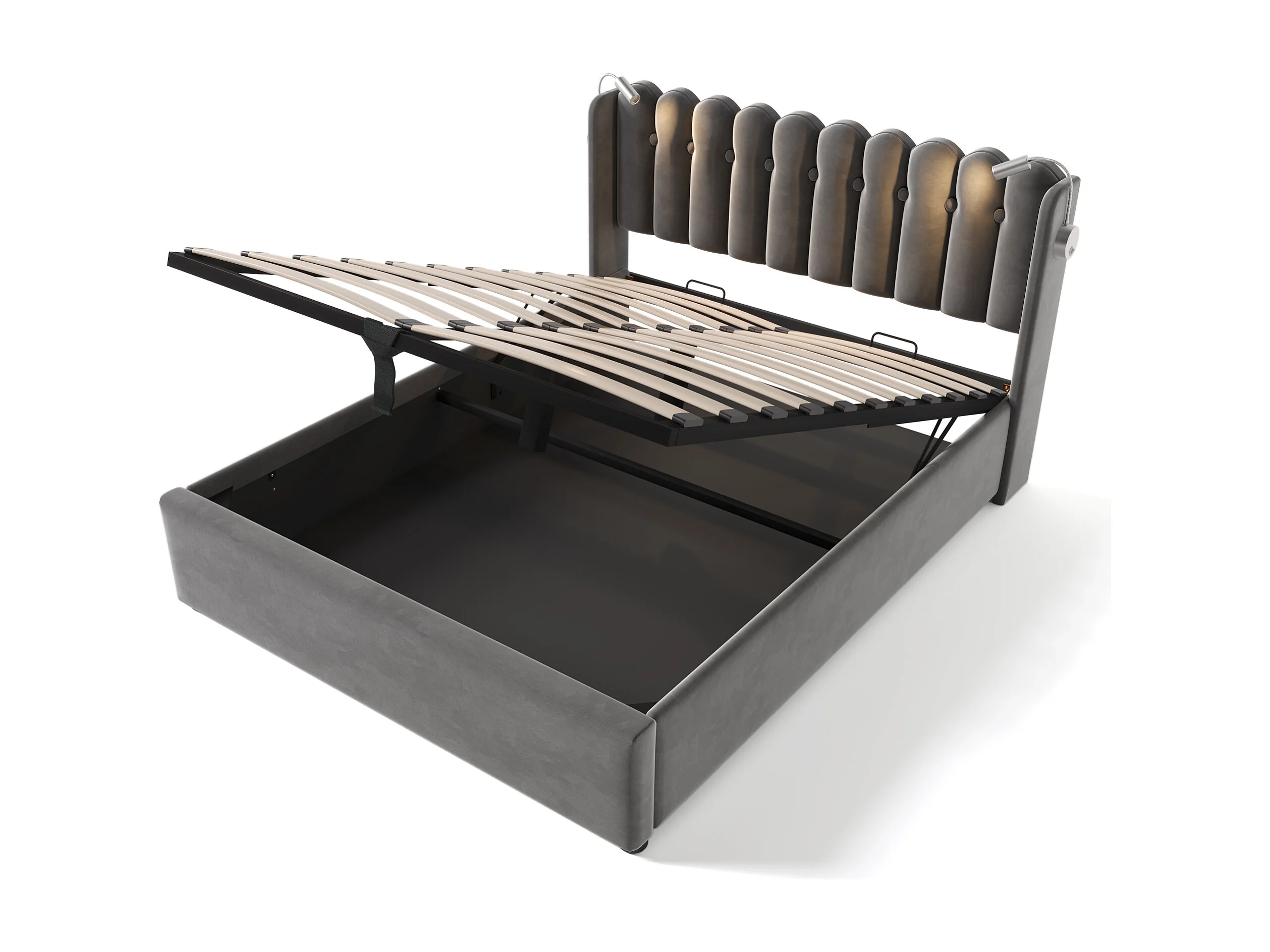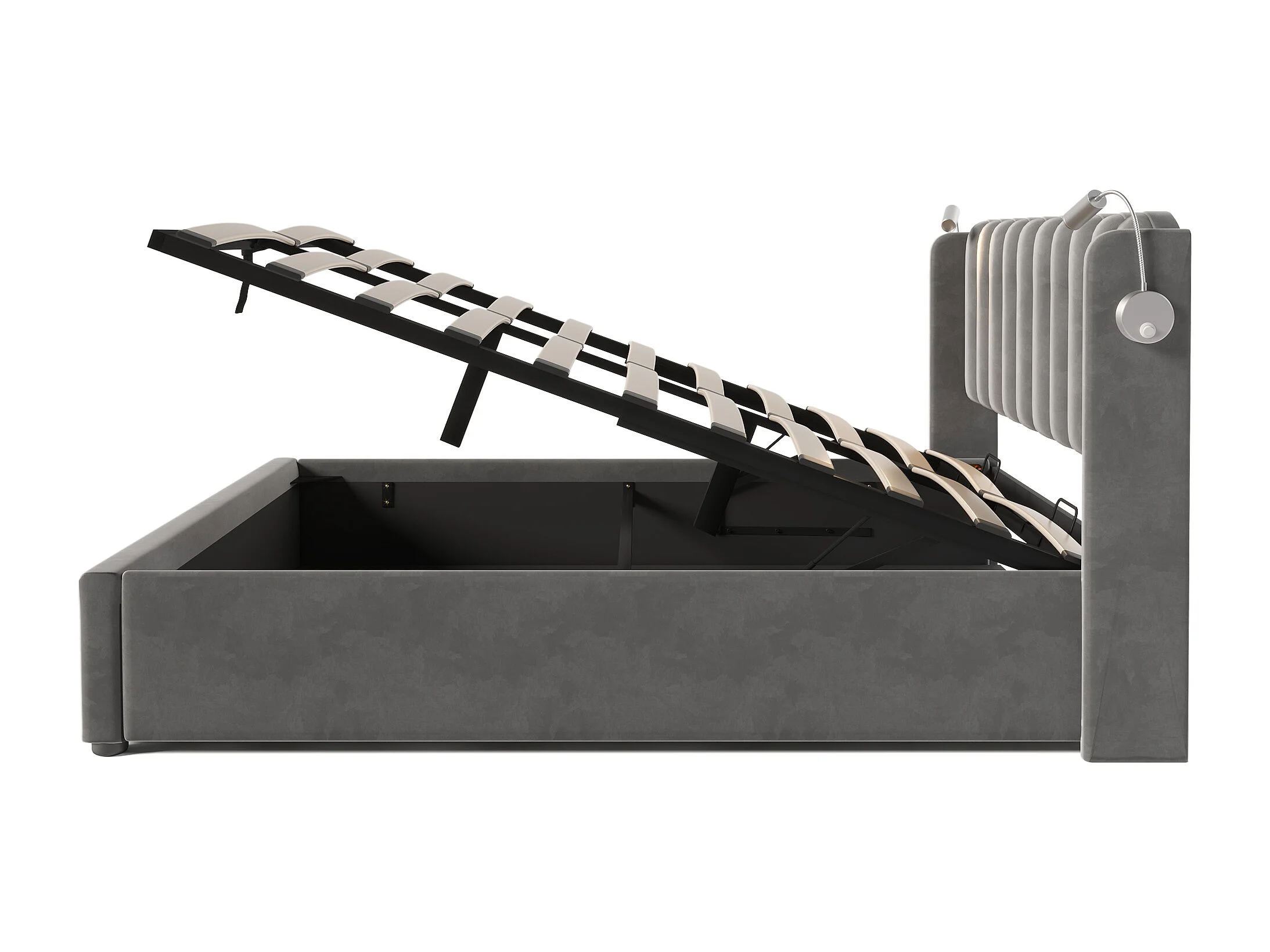 Lit coffre 160x200 cm avec liseuse et chargement USB, velours gris (Sans matelas)