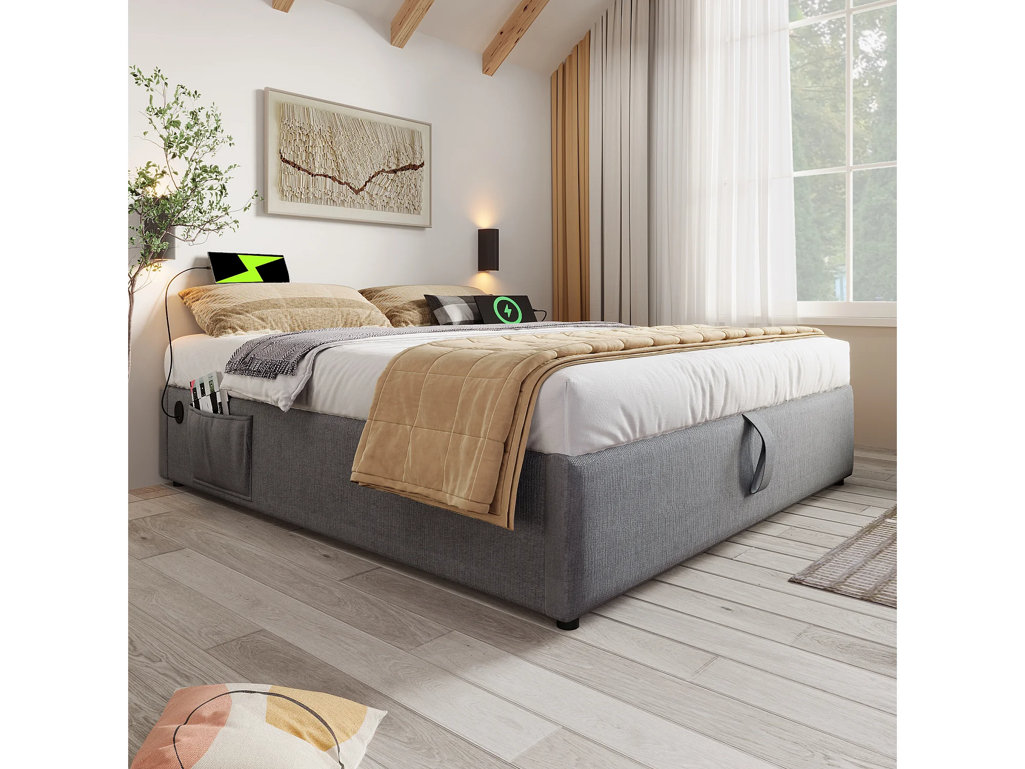 Lit coffre 160x200 cm sans tête de lit - avec USB et rangement latéral - lin coton - gris (sans matelas)