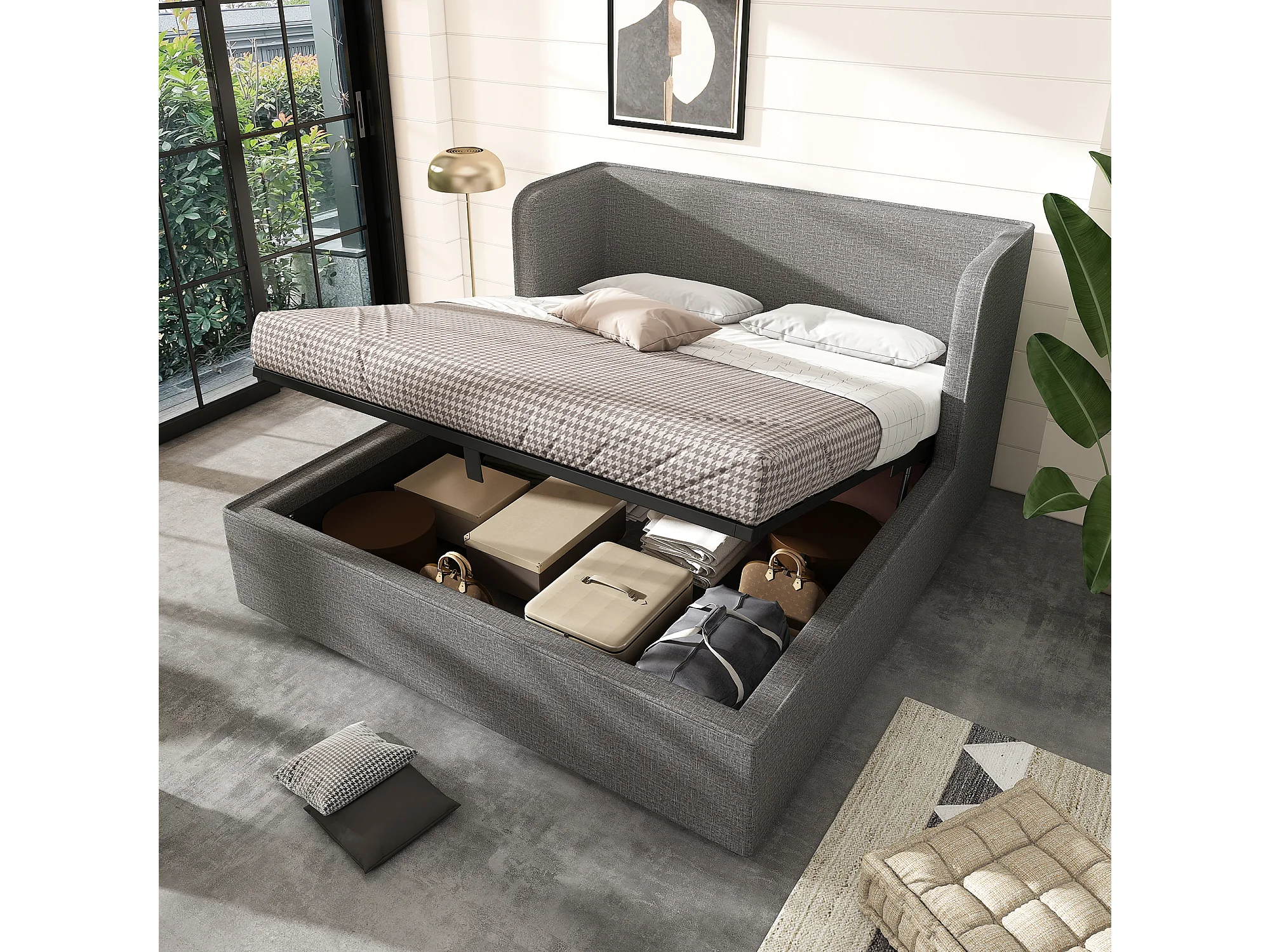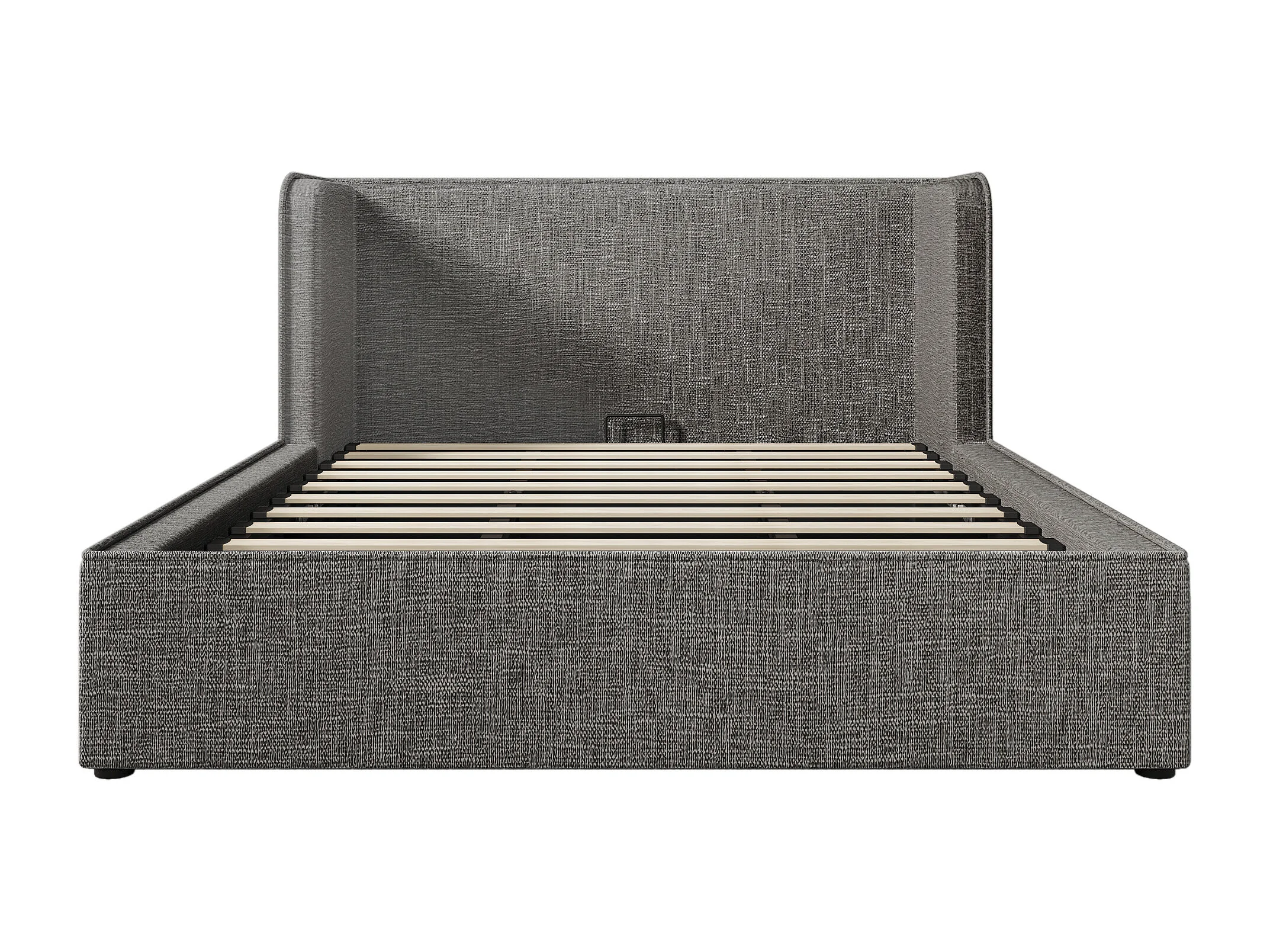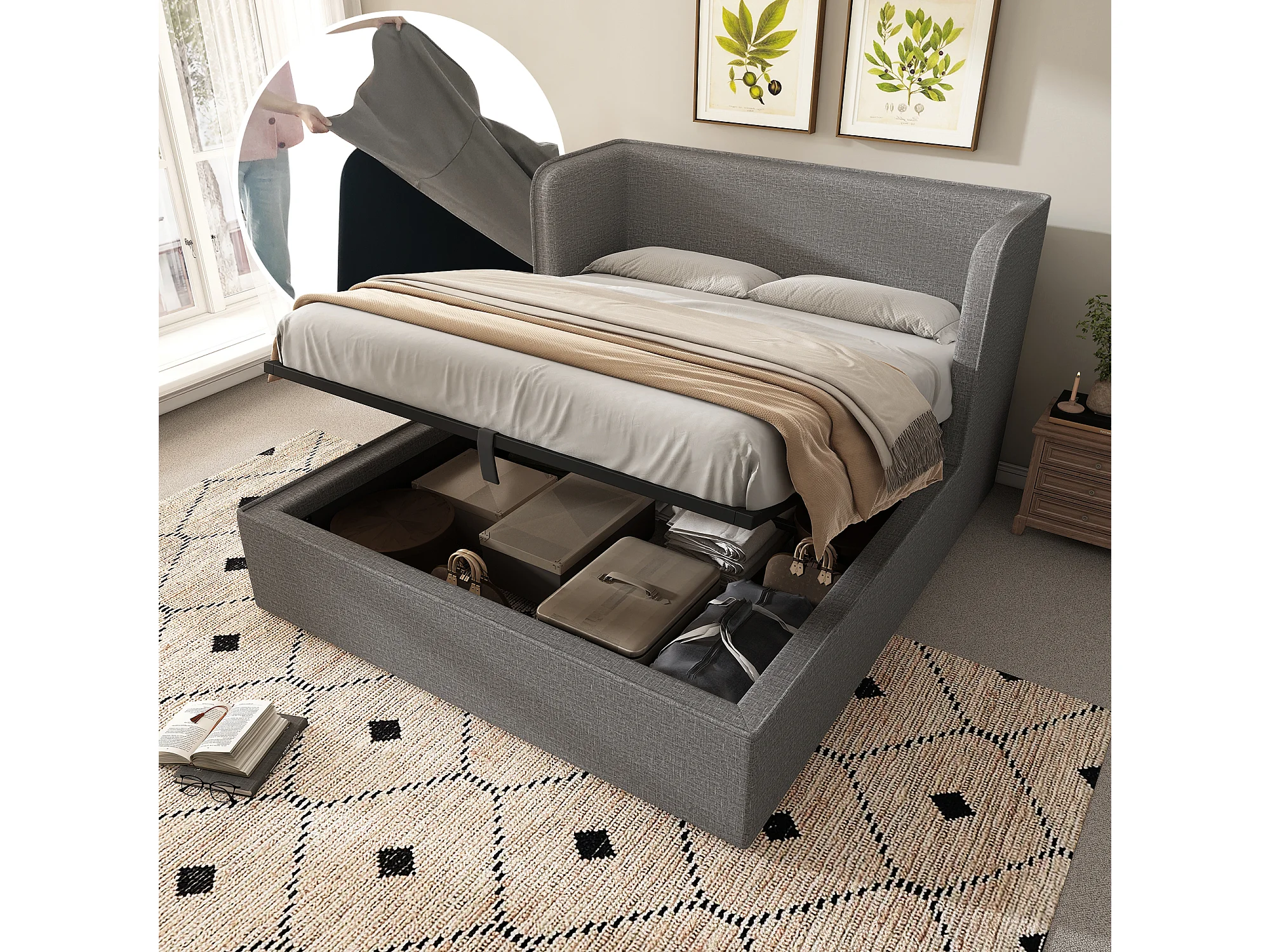 Lit Coffre 160x200cm avec Couvre-lit amovible Espace de rangement Sommier à lattes en bois en gris pour adultes et enfants et adolescents