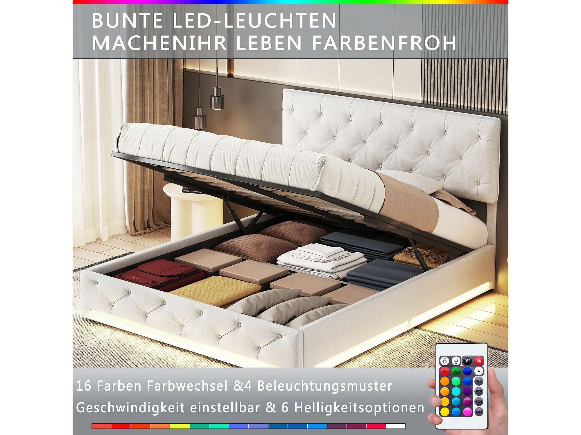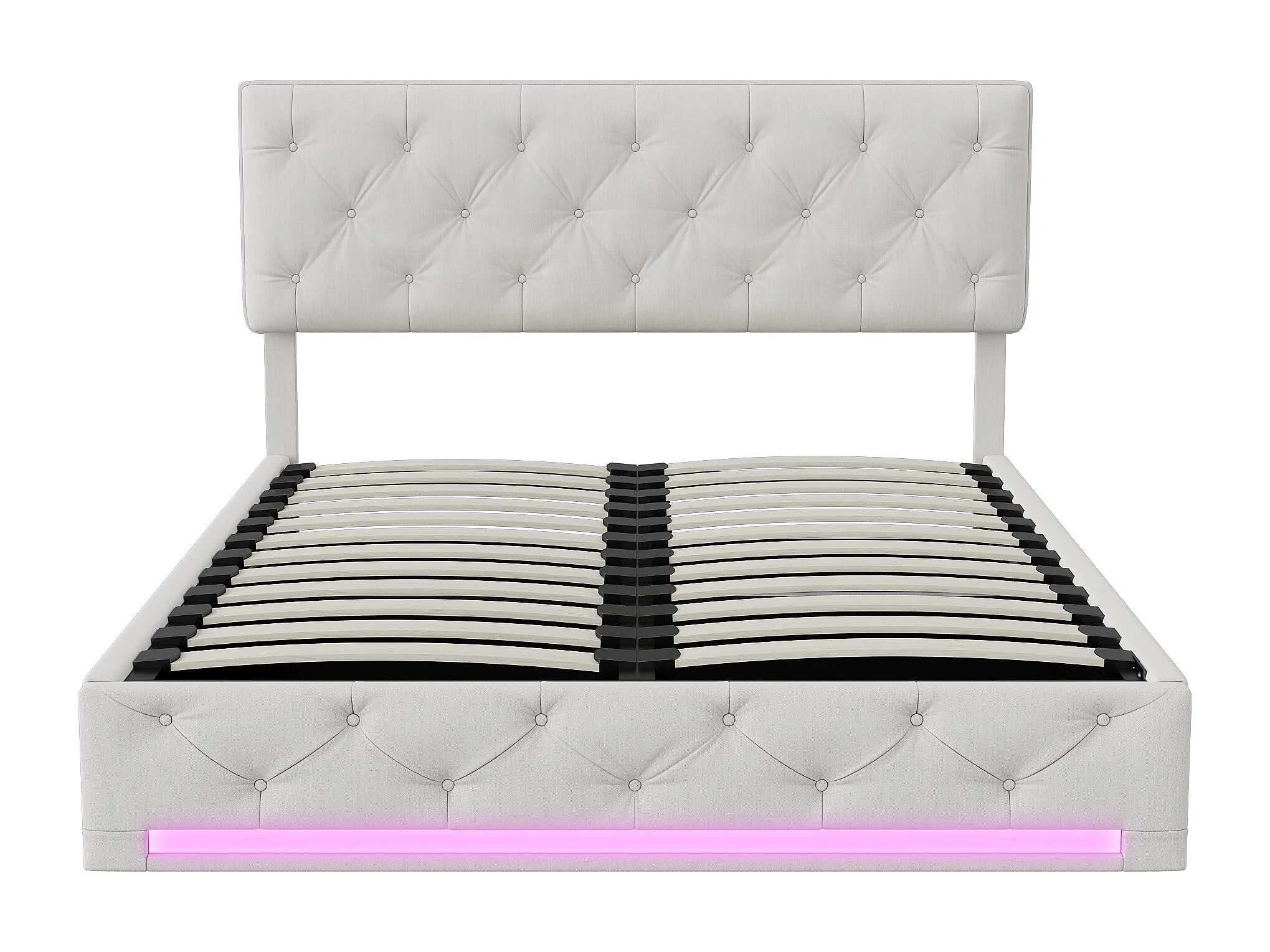 Lit coffre 160x200cm - avec éclairage LED et rangement hydraulique - tête de lit réglable en hauteur - lin - blanc cassé