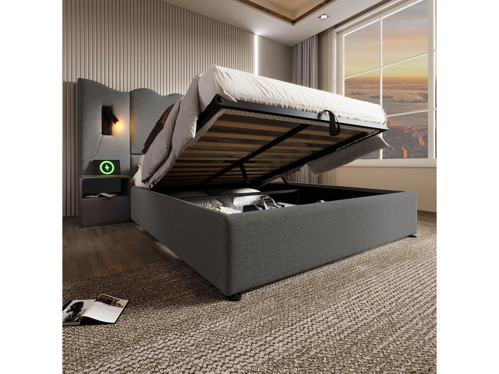Lit Coffre 160x200cm avec USB LED Espace de rangement Sommier à lattes en bois en gris pour adultes et enfants et adolescents