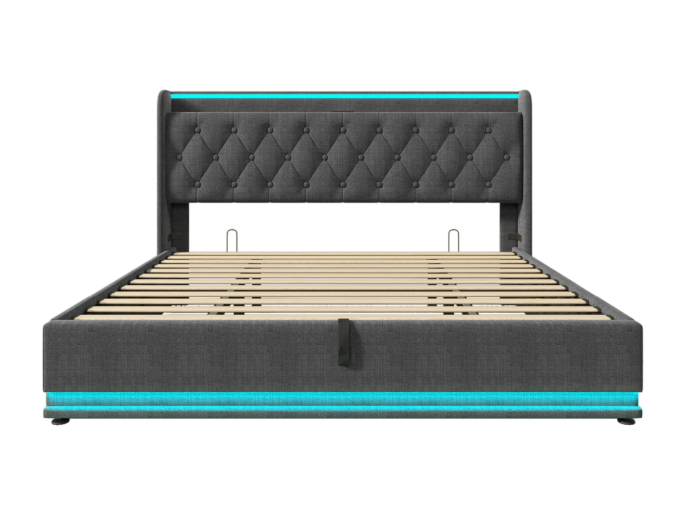 Lit coffre 180x200 cm avec LED 360° et USB Type C, tête de lit capitonnée, lin gris (Sans matelas)
