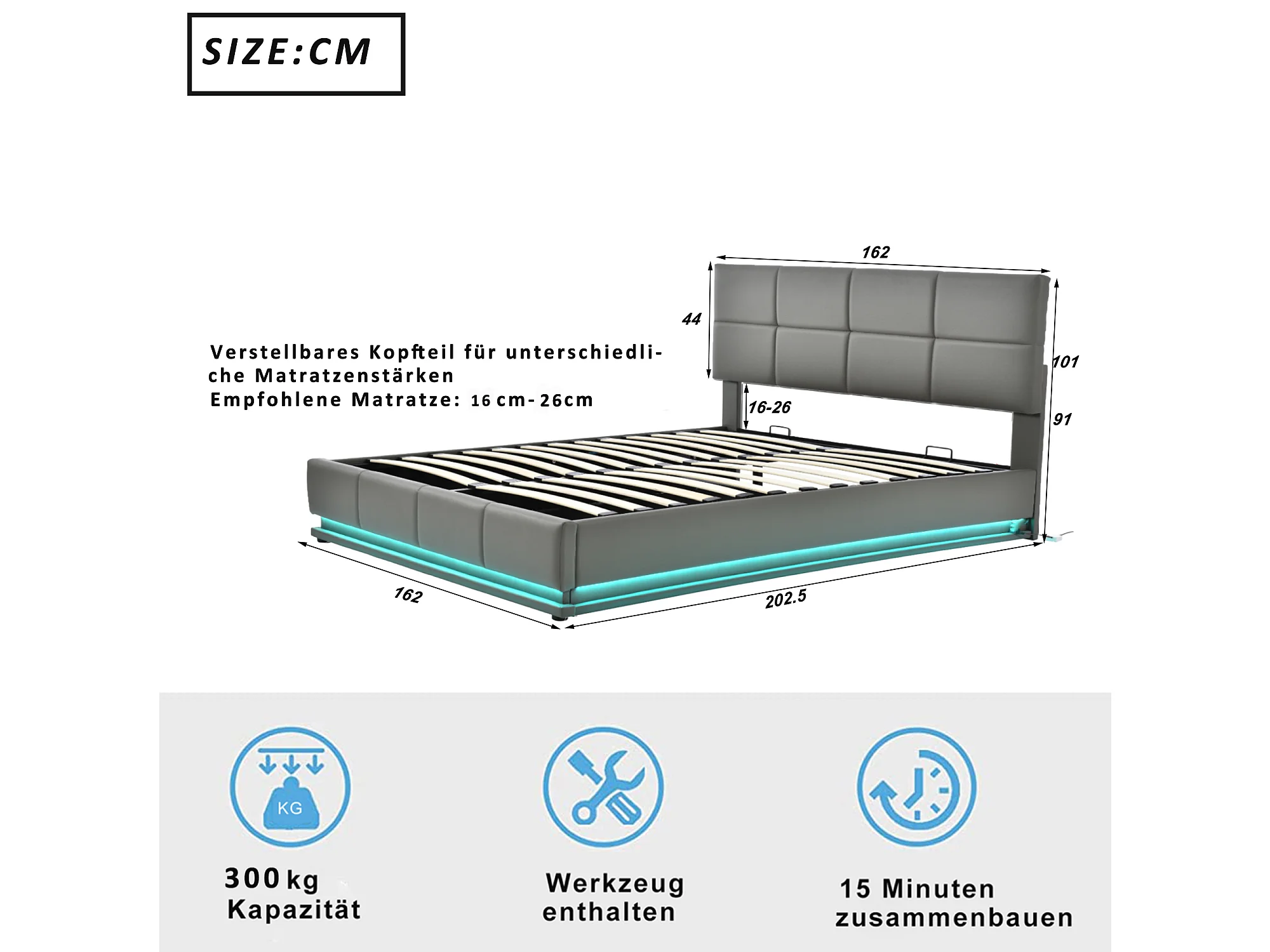Lit Coffre 202.5x162x101 cm avec LED Tête de lit rembourrée réglable en hauteur Espace de rangement en gris pour adultes et adolescents