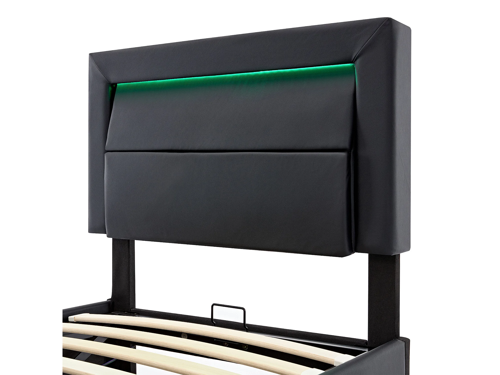 Lit coffre 90x190 cm avec sommier - tête de lit capitonnée avec LED et USB - similicuir - noir (sans matelas)