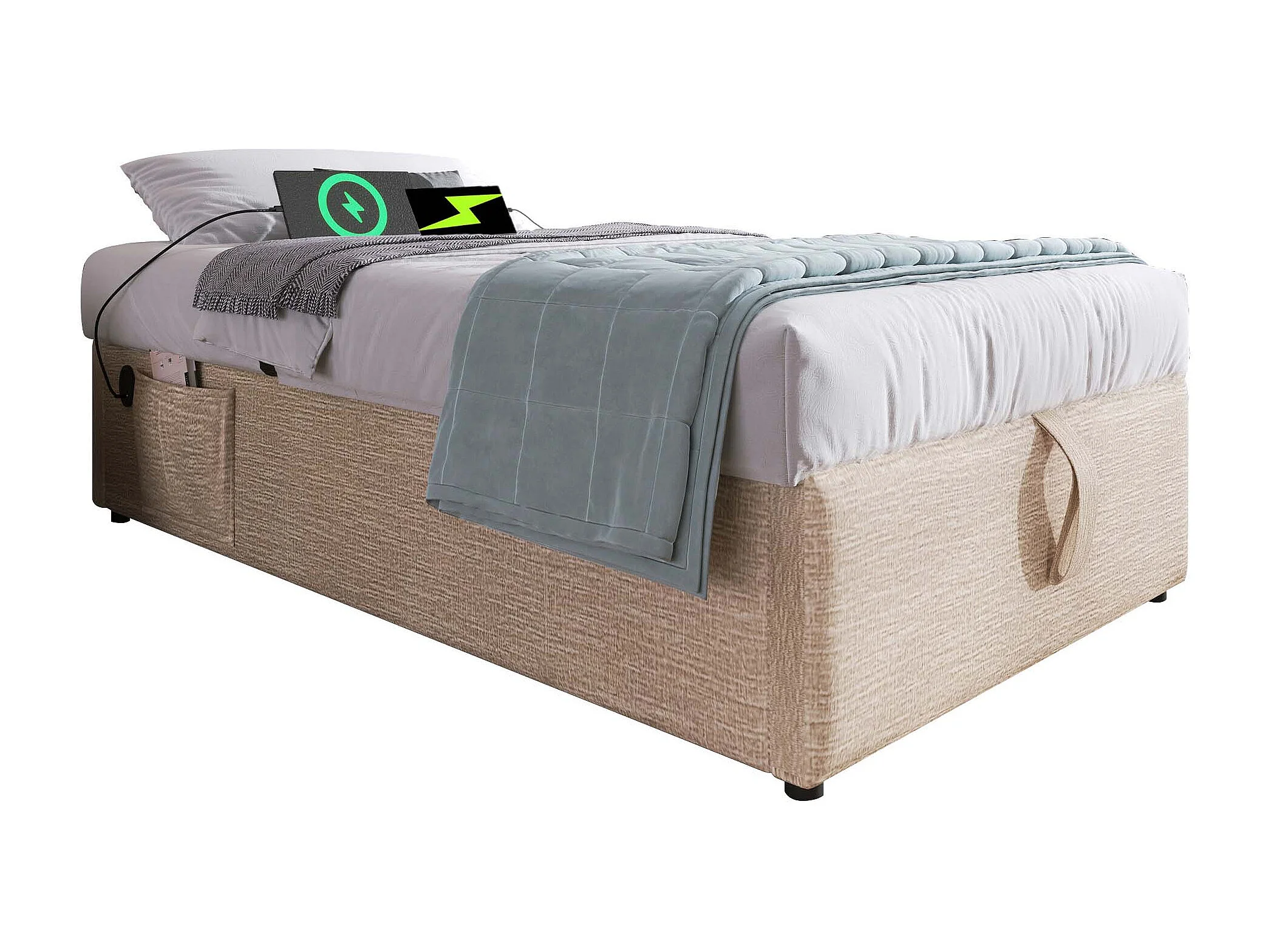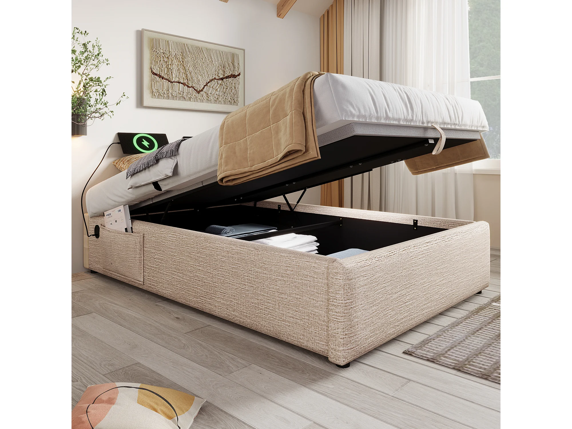 Lit coffre 90x190 cm avec USB C et rangement hydraulique, lin, naturel (Sans matelas)
